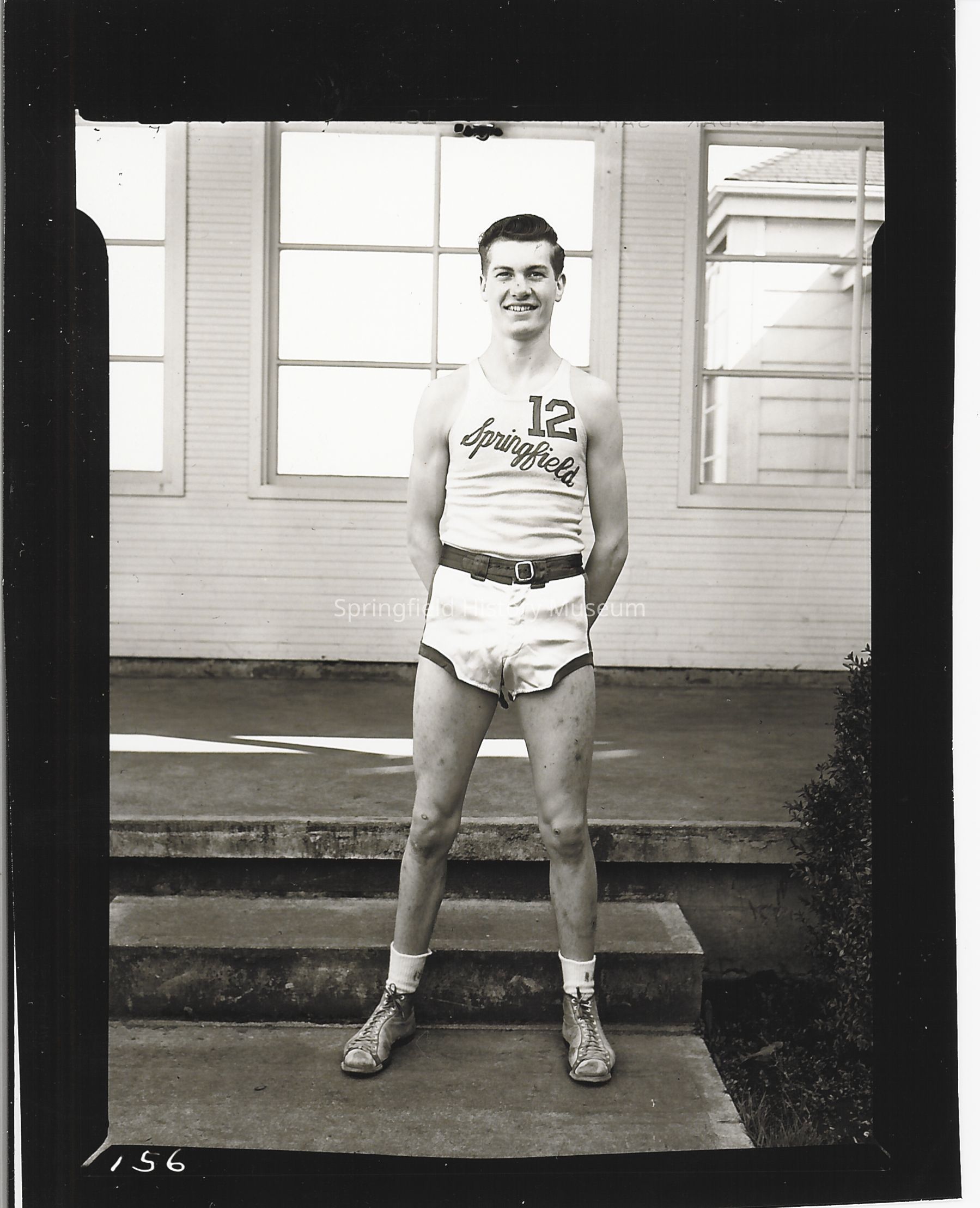 Student, Stan Aune, standing in front of school building in a Springfield High Basketball uniform. 1945.