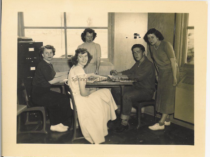 Springfield High school female students working on a project at a table, with windows in background and on right side of photo, file cabinet on left side of photo. circa 1950.
