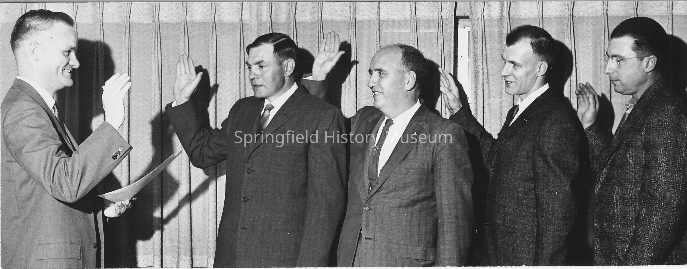 Swearing-in ceremony of Springfield Mayor and City Council members: Ed Buckholy, B. J. Rogers, and Larry Wojcik. Bill Mansell presiding. Undated (early 1960's)