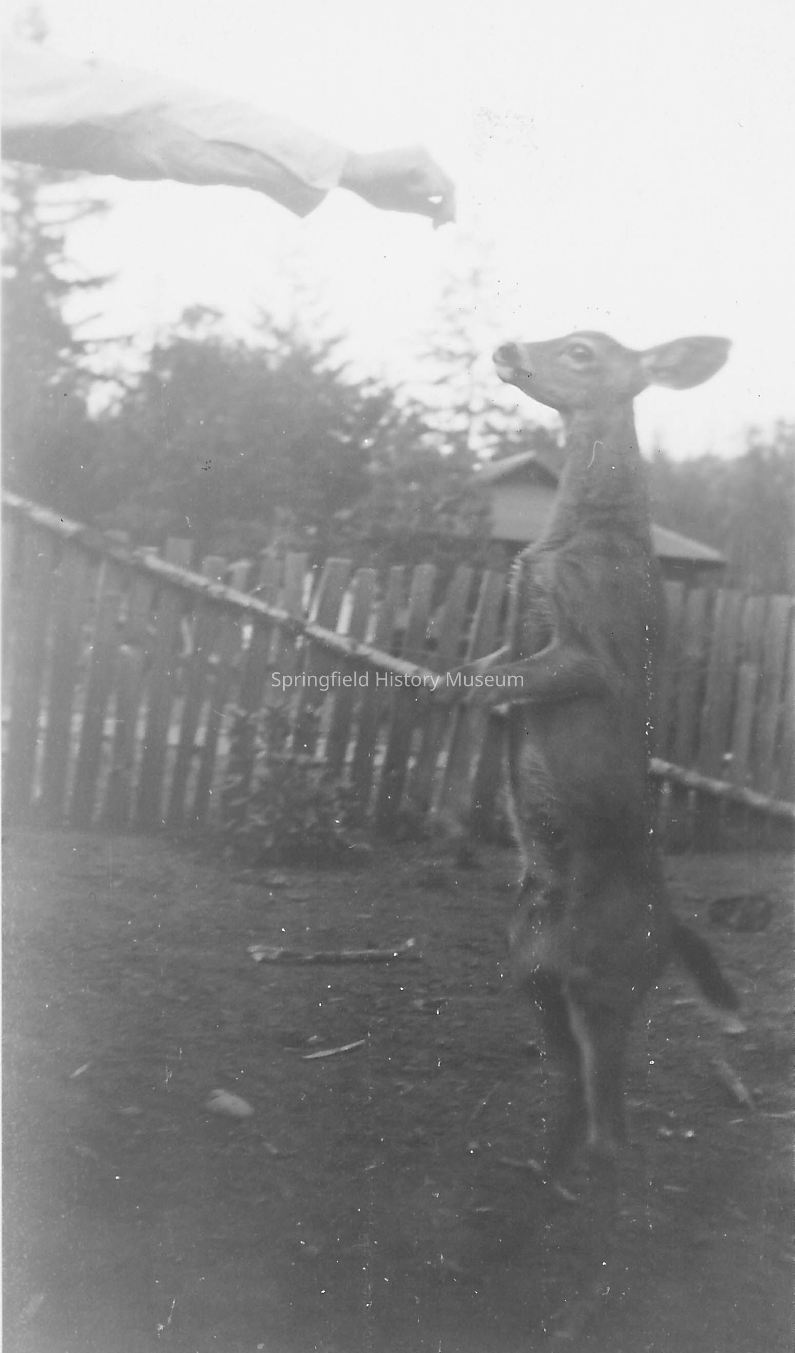 One deer standing up on its hind legs. A human arm extends into the photo, offering the deer a treat. Undated