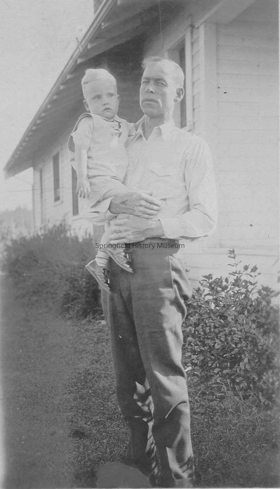 Man holding a child. Thorval Hysten holding son, Wyne. Superintendent of Booth Kelly Lumber Company. Undated.