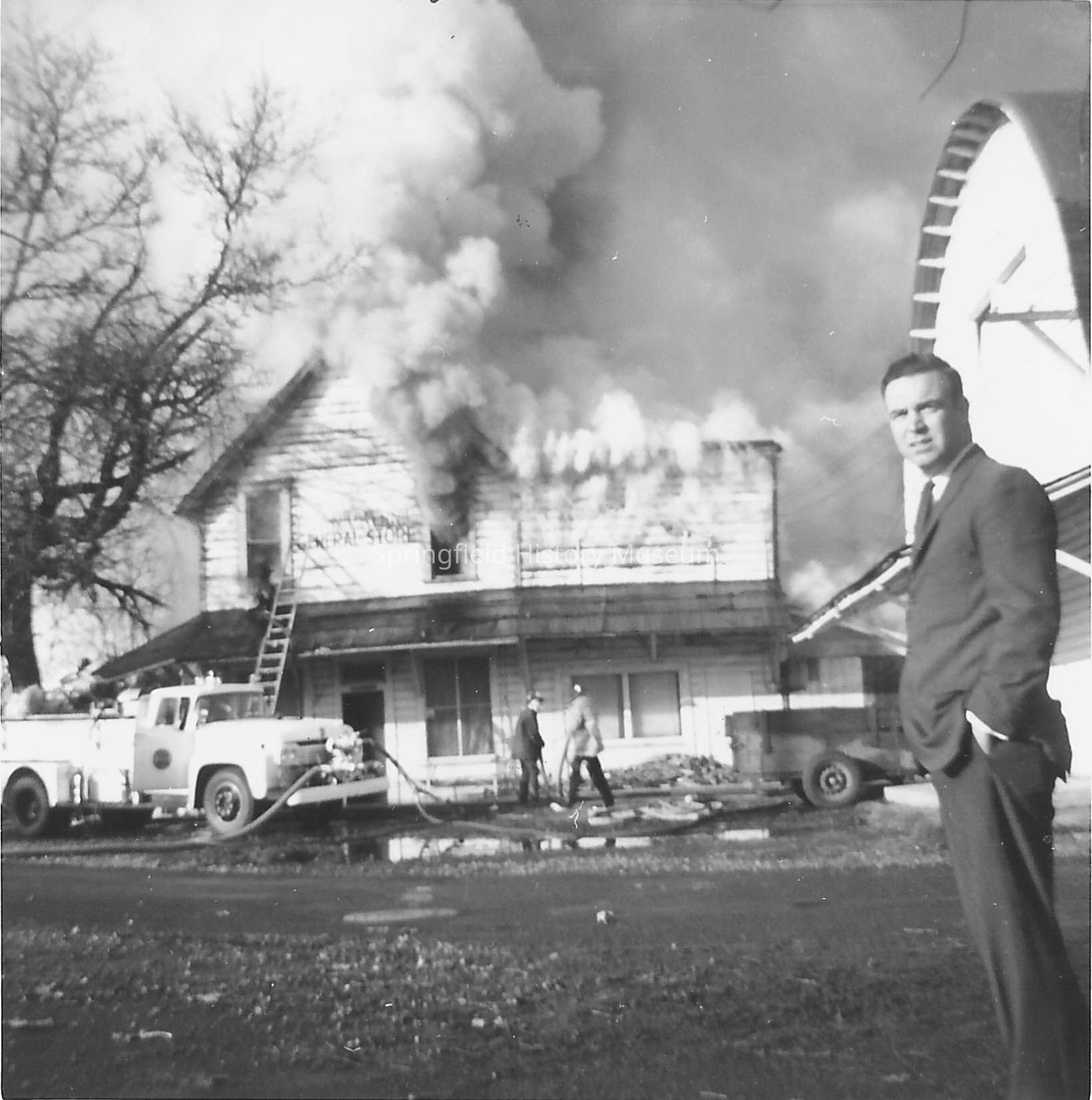 Fire at Thurston General Store: November 23, 1965. Fire truck, firemen, one unidentified man in foreground looking towards camera.
