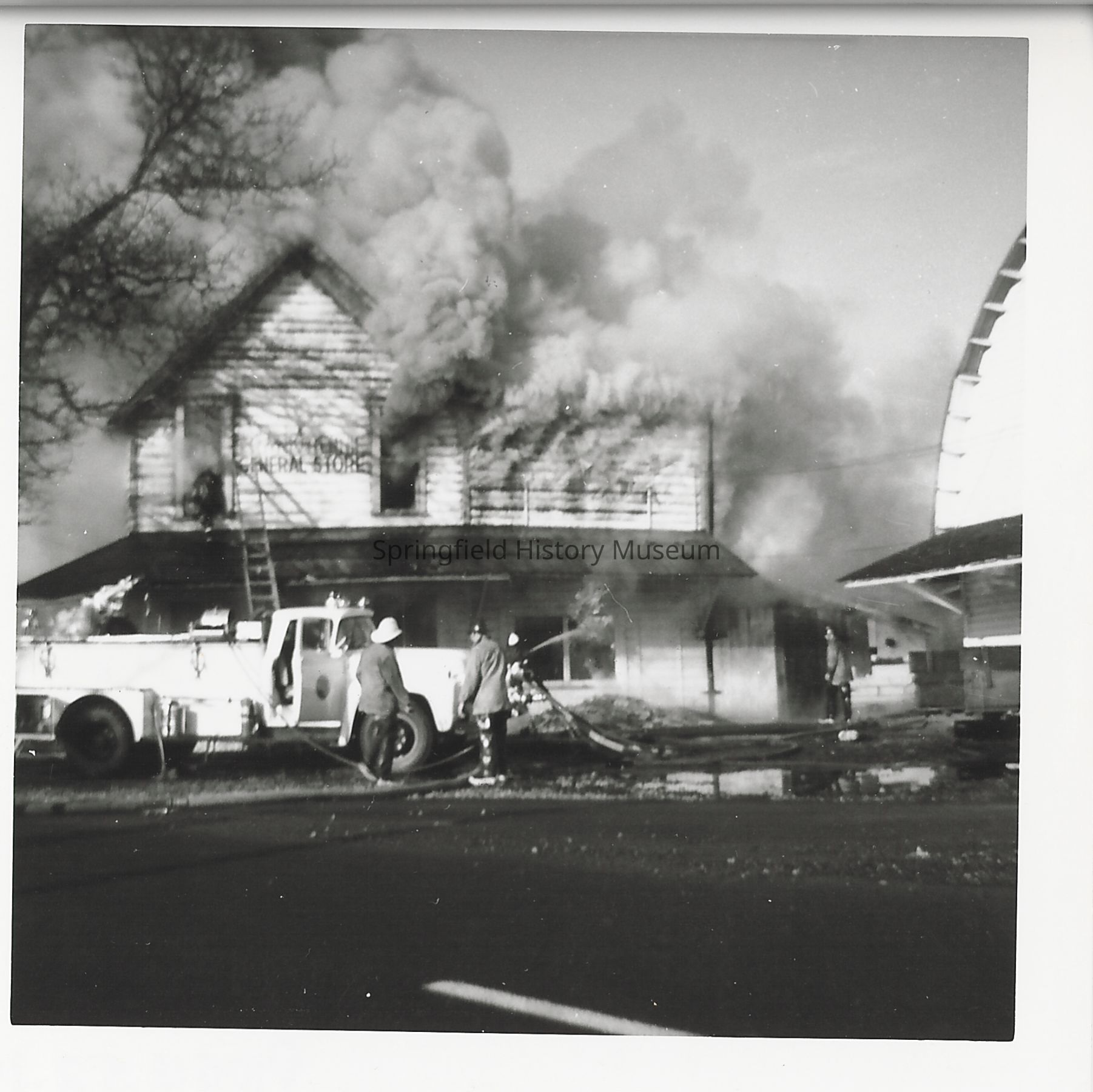 Fire at Thurston General Store: November 23, 1965. Fire truck and two firemen.