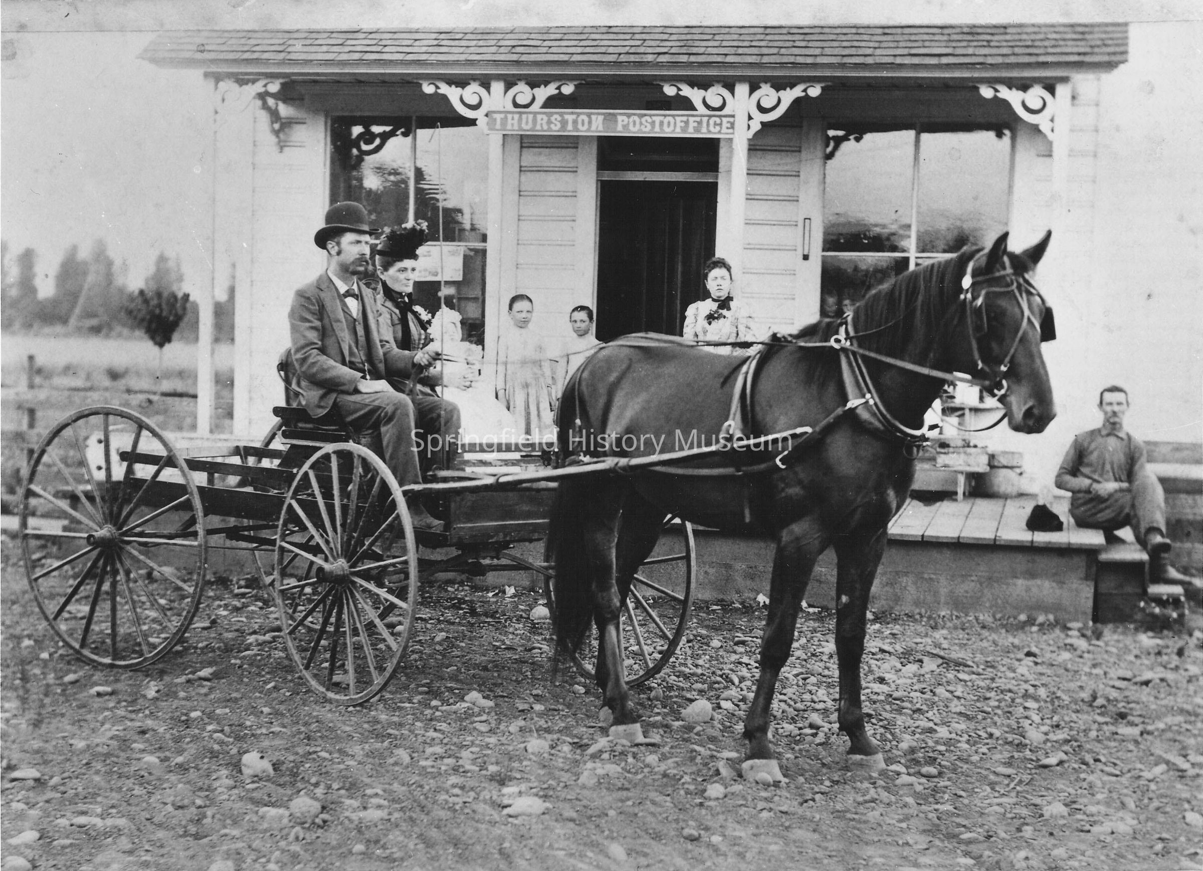 Carriage with a man, woman, and infant in front of Thurston Post Office and Store. Four people are on the porch of the Post Office. One horse hitched to carriage. The "N" in "THURSTON" on the Post Office sign is backwards. Stamped with J.A. Briggs business stamp on back (see photographer info Authority). Undated