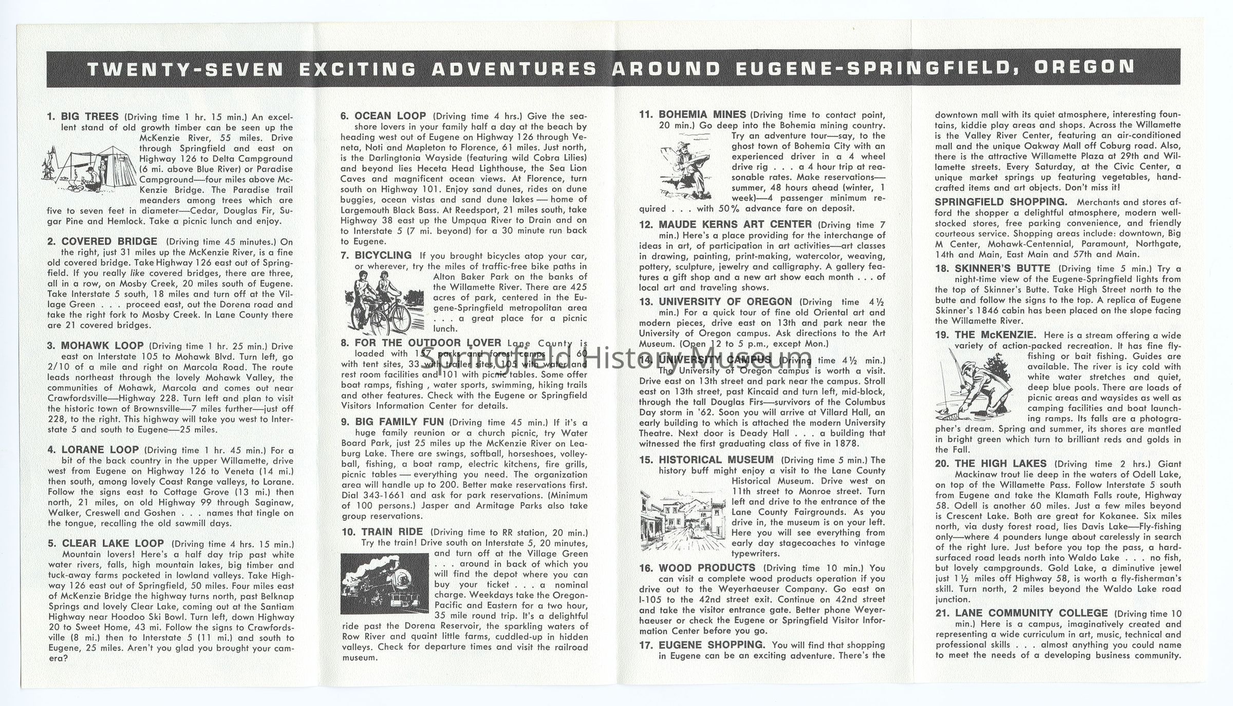 Tourist Map of Eugene and Springfield area, "27 Exciting Adventures around Eugene-Springfield Oregon", undated, circa 1990. Photograph of fisher on cover.Context