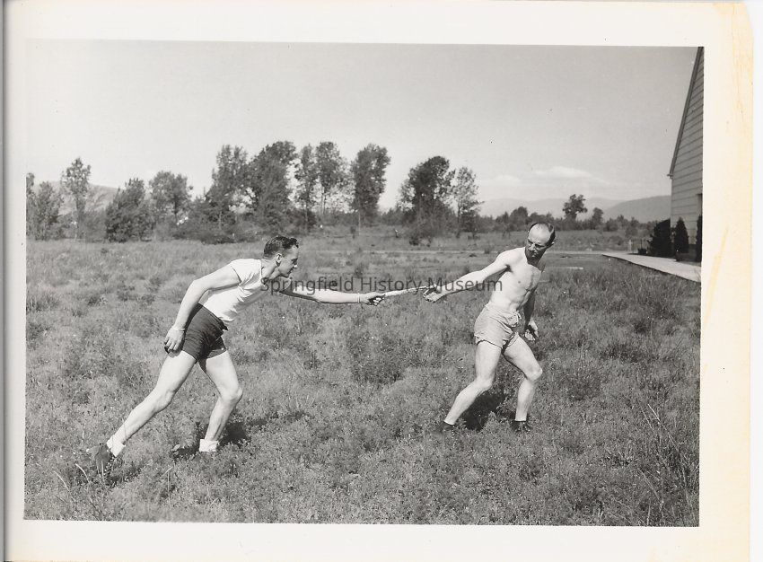 Springfield High School Track coach, Kernal Buhler [left] and Basketball coach, Paul Johnston. [right] Handing cloth off to one another in a exercise outside in a field, with school building on left side of photo with trees in background.1940s