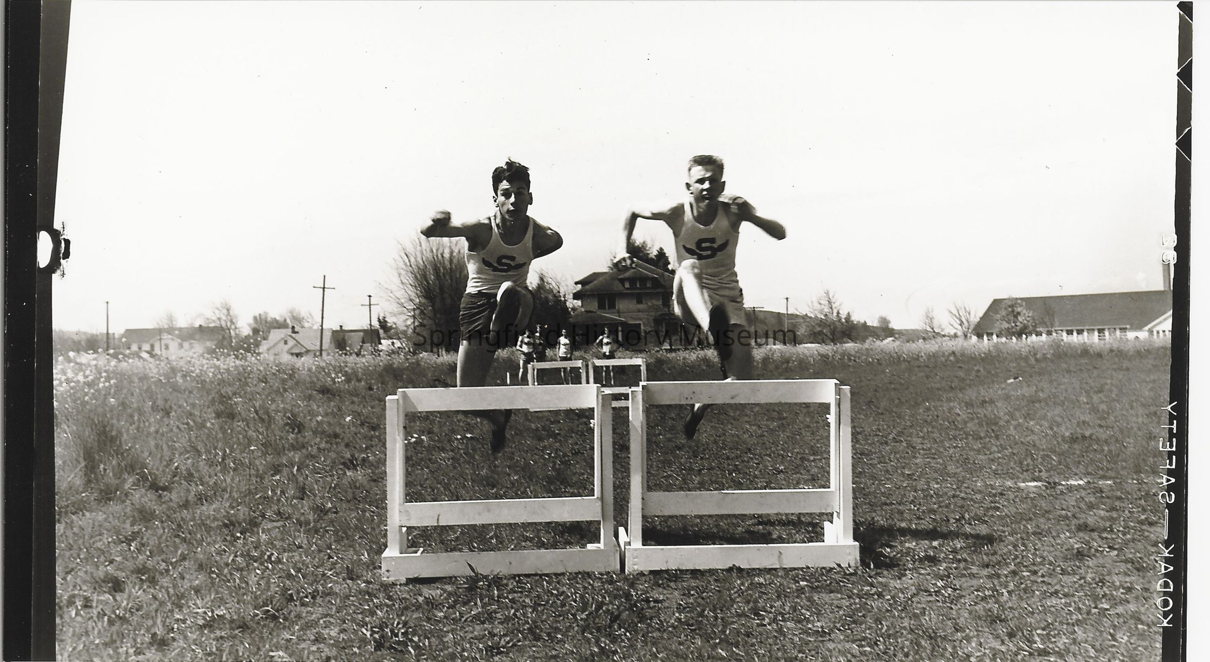 Boys jumping over hurdles in a field, houses and part of school in background. Springfield 1940s.