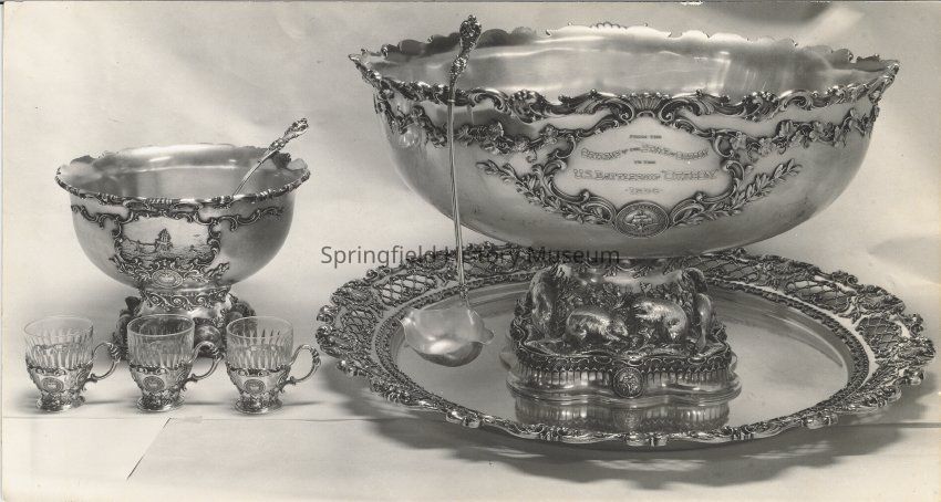 Punchbowl set from U.S.S. Oregon silver service, which cost $26,000 raised by school children of Oregon. The 1982 value was estimated at $350,000. Larger punchbowl inscription reads: "From the Citizens of the State of Oregon to the U.S. Battleship 'Oregon.' 1896". Undated