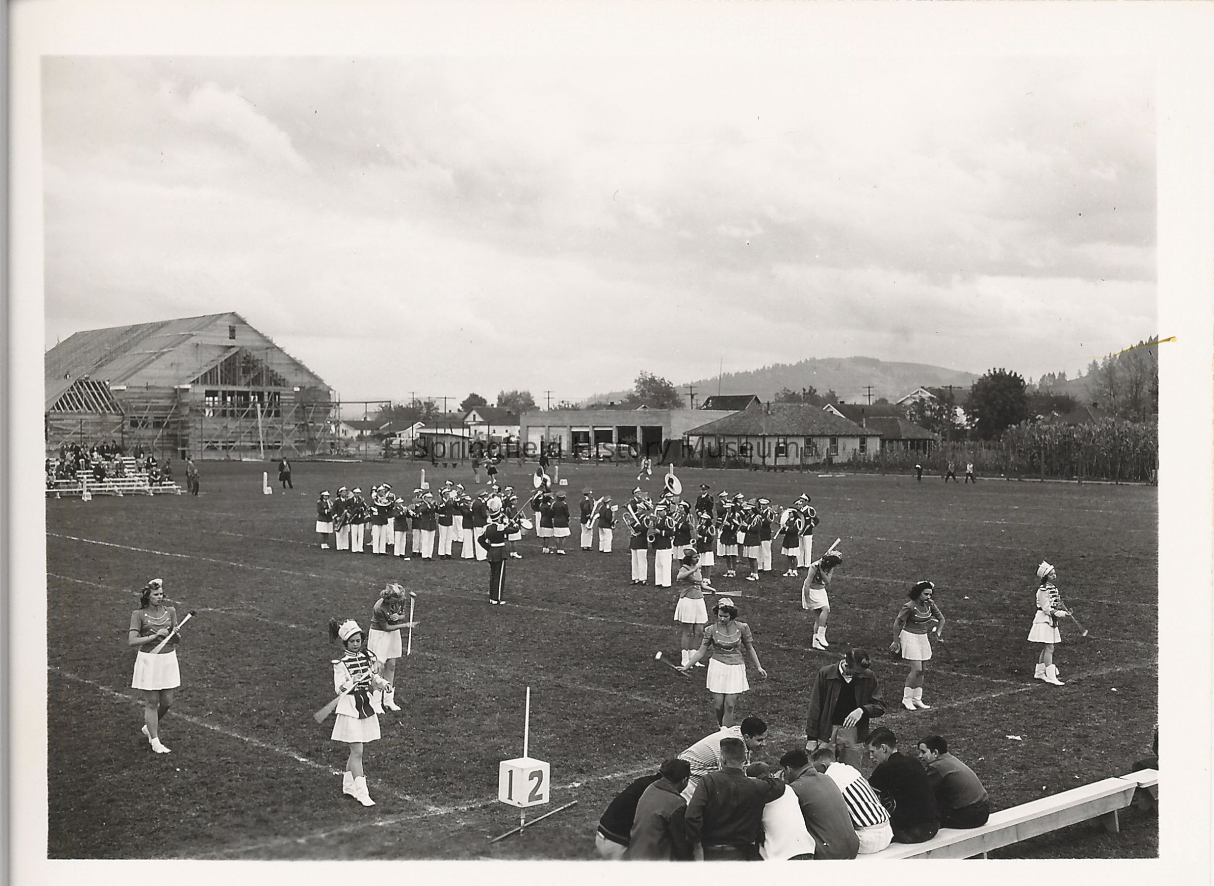 Band students practicing on football field, houses and buildings in back ground. People on side of ball field observing, Springfield Union High 1940s