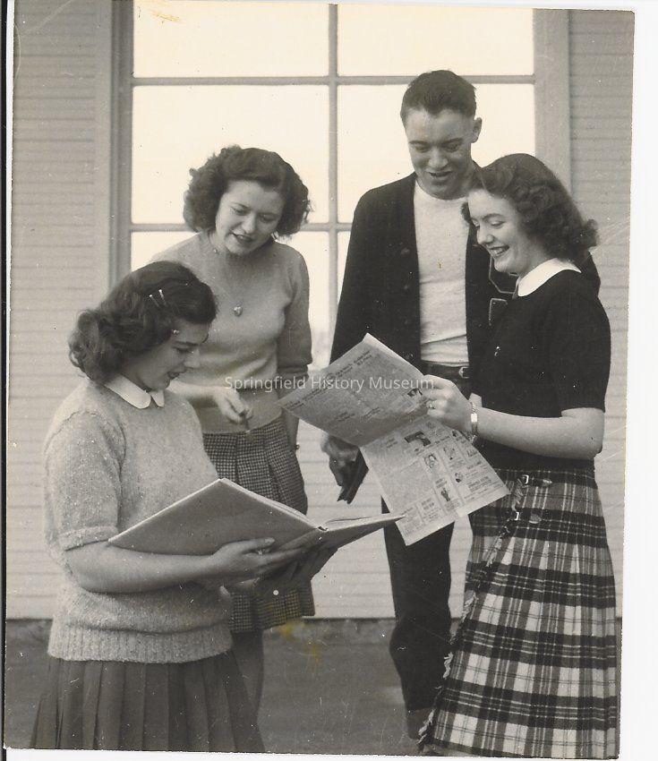 Springfield Union High School Newspaper staff, going over newspaper articles outside of school building. Class of 1949