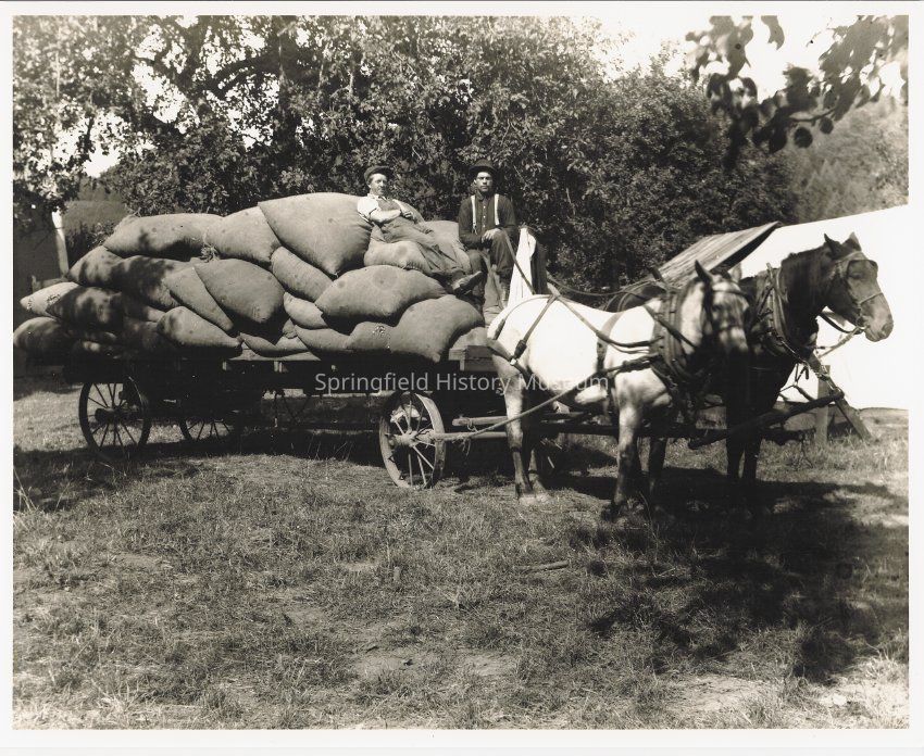 Two men on a wagon full of big bags of hops, two horses pulling the wagon are Blacky and Shorty. Undated.