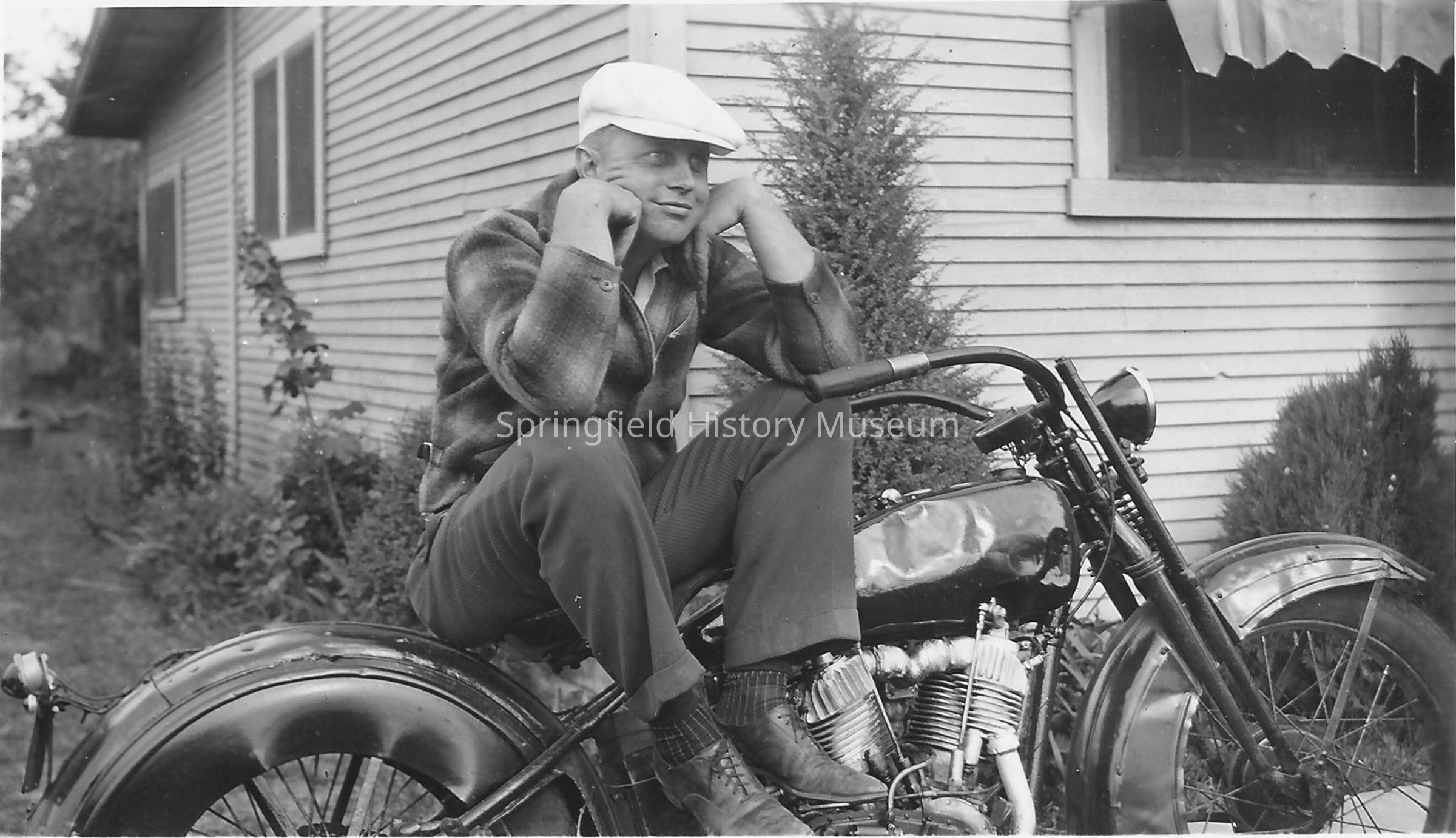 Wayne Hayes. Man in white cap, sitting on motorcycle in front of a house. Undated (1940's?)