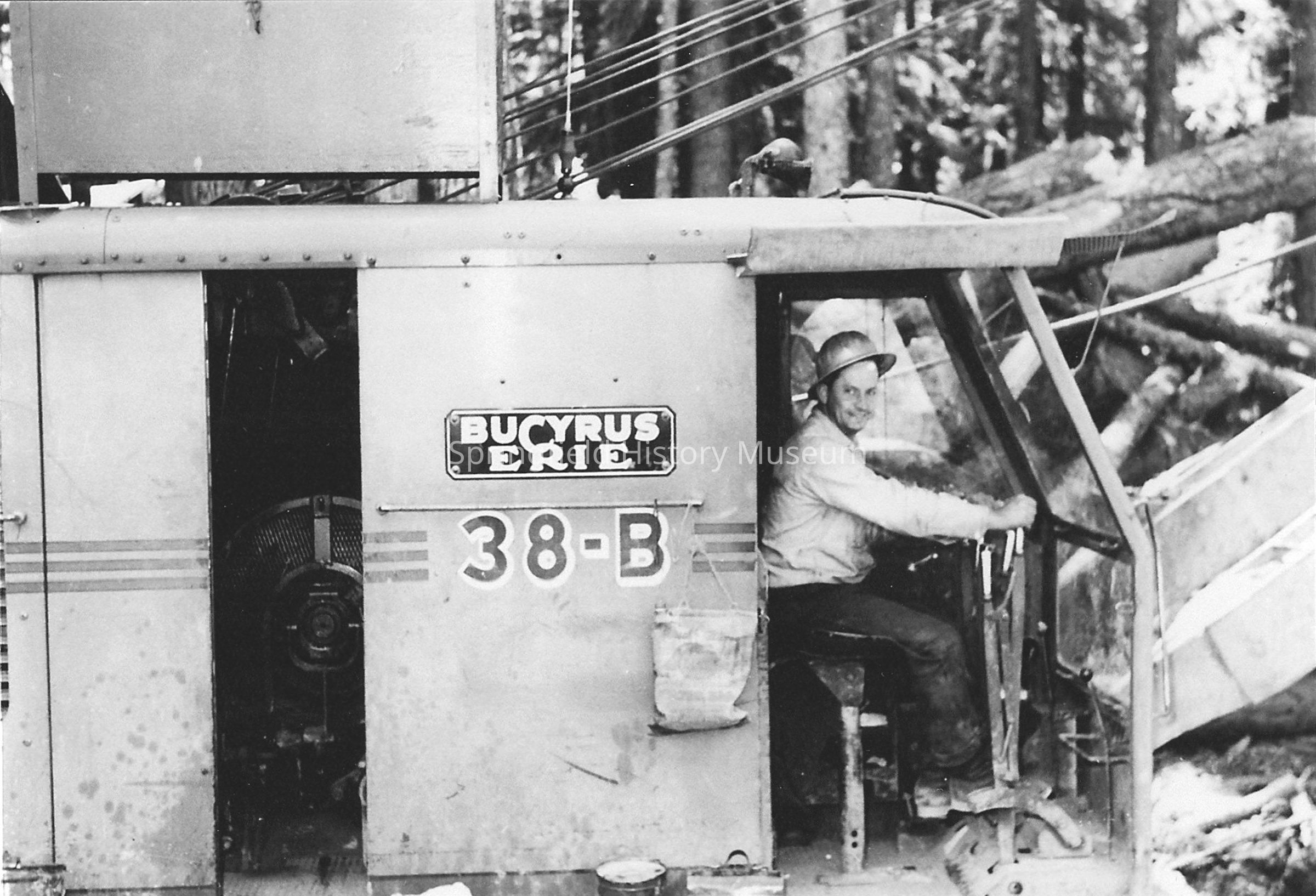 Weyerhauser loader, unidentified driver in a Bucyrus Erie heel boom loader. Undated