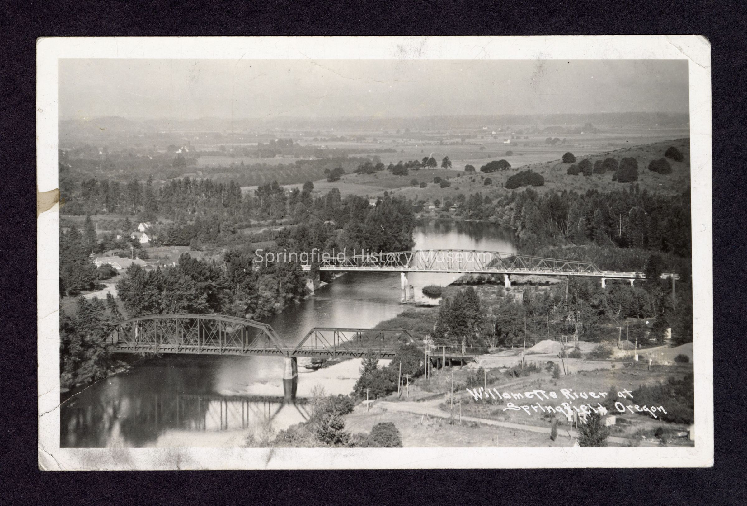 Postcard view of Willamette river with 2 bridges. "Willametter River at Sprinfield Oregon" on front. On reverse: note to Mr. Keppner from F H Barrett of Eugene. Postal mark dated 16 May 1940. "Dear Sir- I have lumber to trade and am also a carpenter. I would like to get in touch with you. R.H.Barrett Rt 2, Eugene"