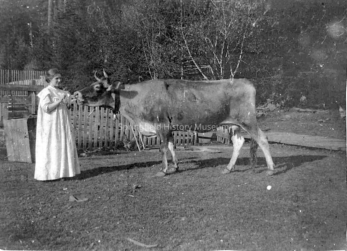 Lady with a cow. Writing on reverse: "Dear Belvin, Will send you Perrey on a card. Hearry. [To] Master Belvin Doane, Springfield, Oregon." Undated (around 1900)