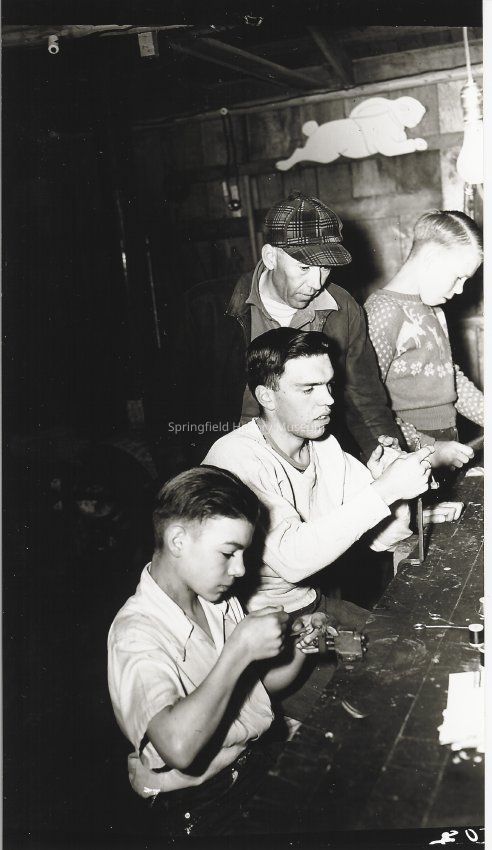 Springfield High woodworking class teacher identified as Joe Rhoner and two students identified as Harold Parks, Garth McGuire. In clasroom working with tools.