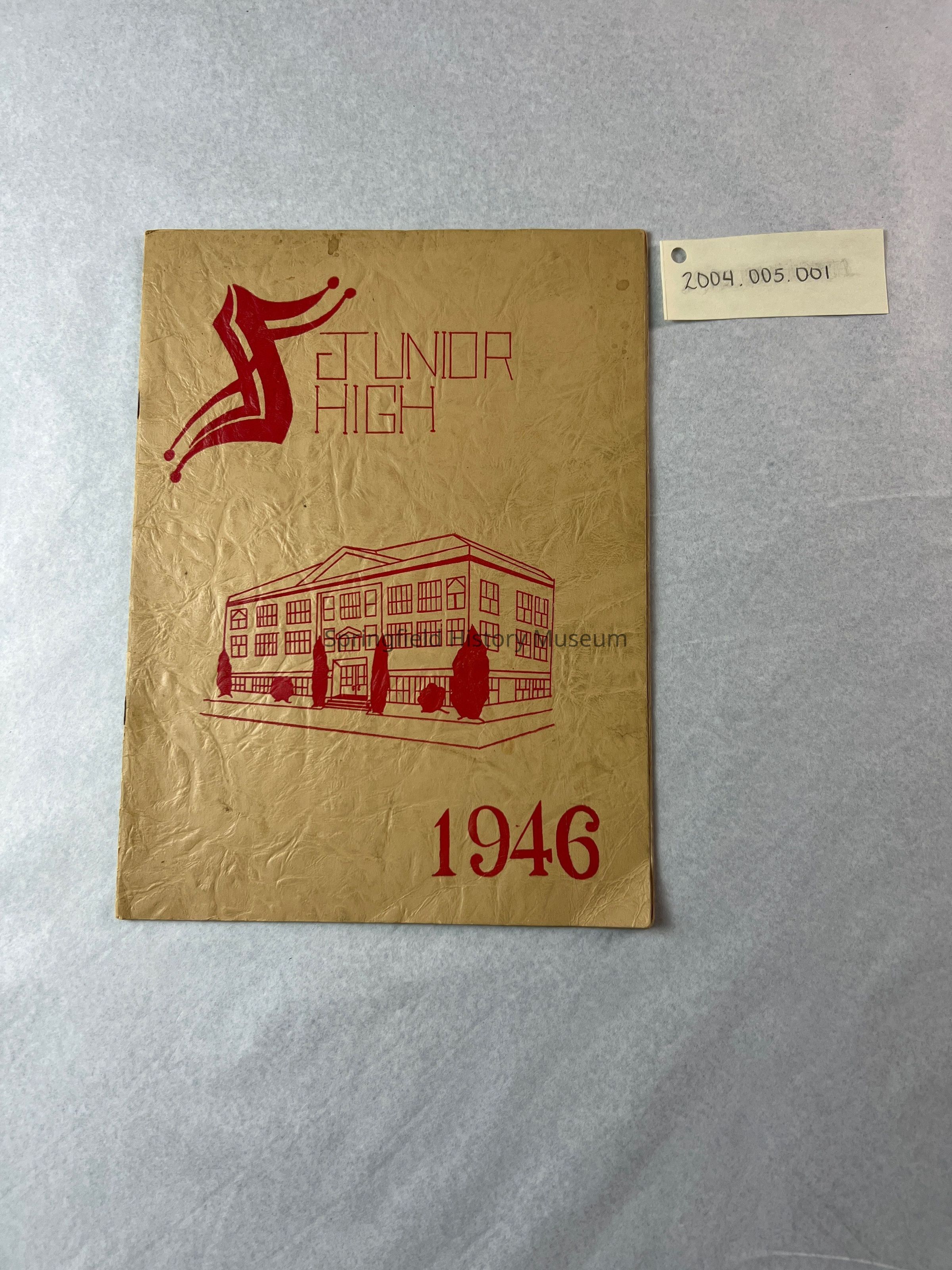 Year Book 1946 of S Junior High. Physical Description: Soft Bound Cover Cream Color with Red writing with drawing of school on front cover.