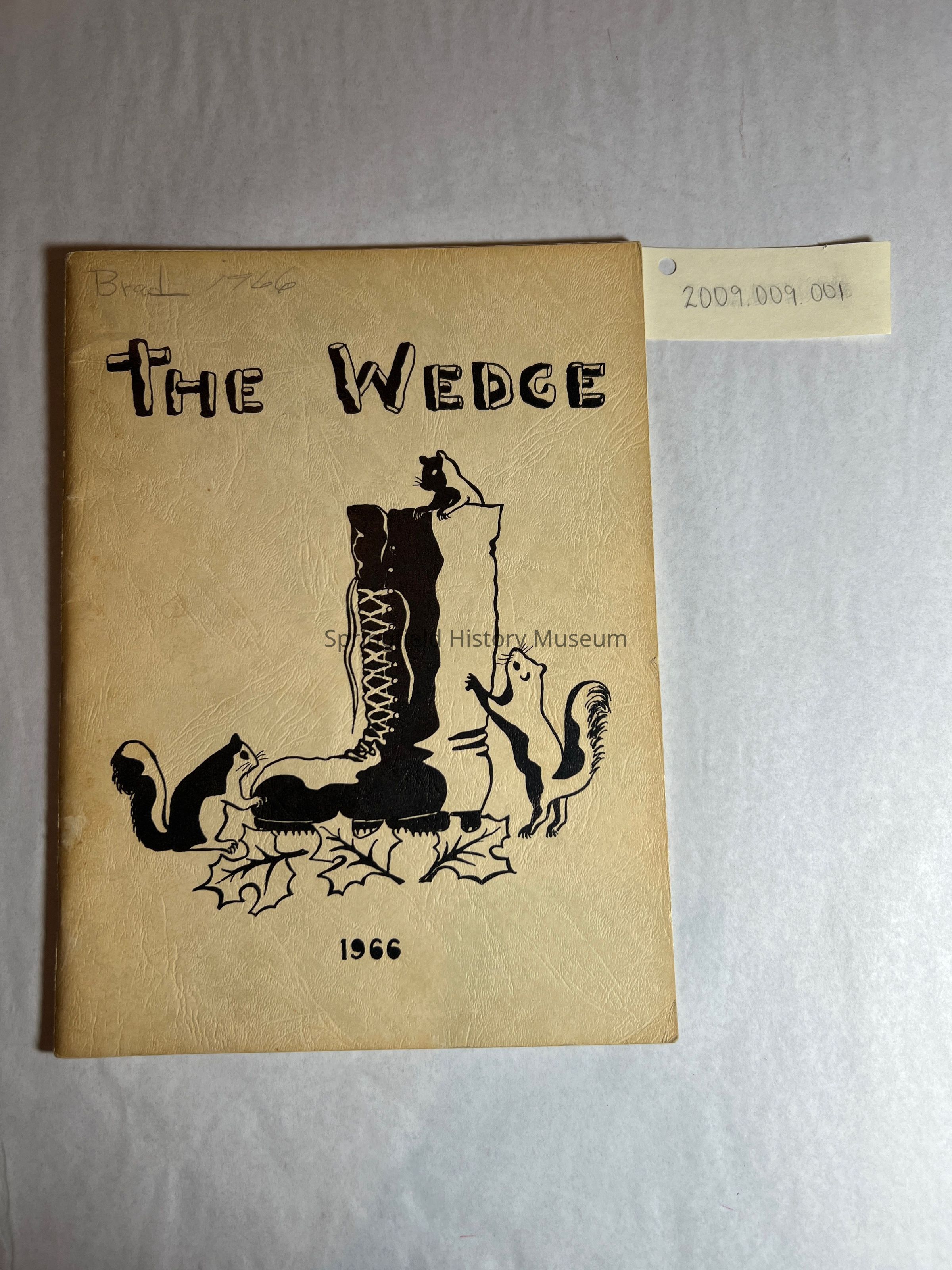 1965 - 1966 edition of "The Wedge". Hamlin Jr. High School Volume Eight. Has Brad Hollister written on inside of front cover. Front cover has boot with three squirrels on it. Softbound