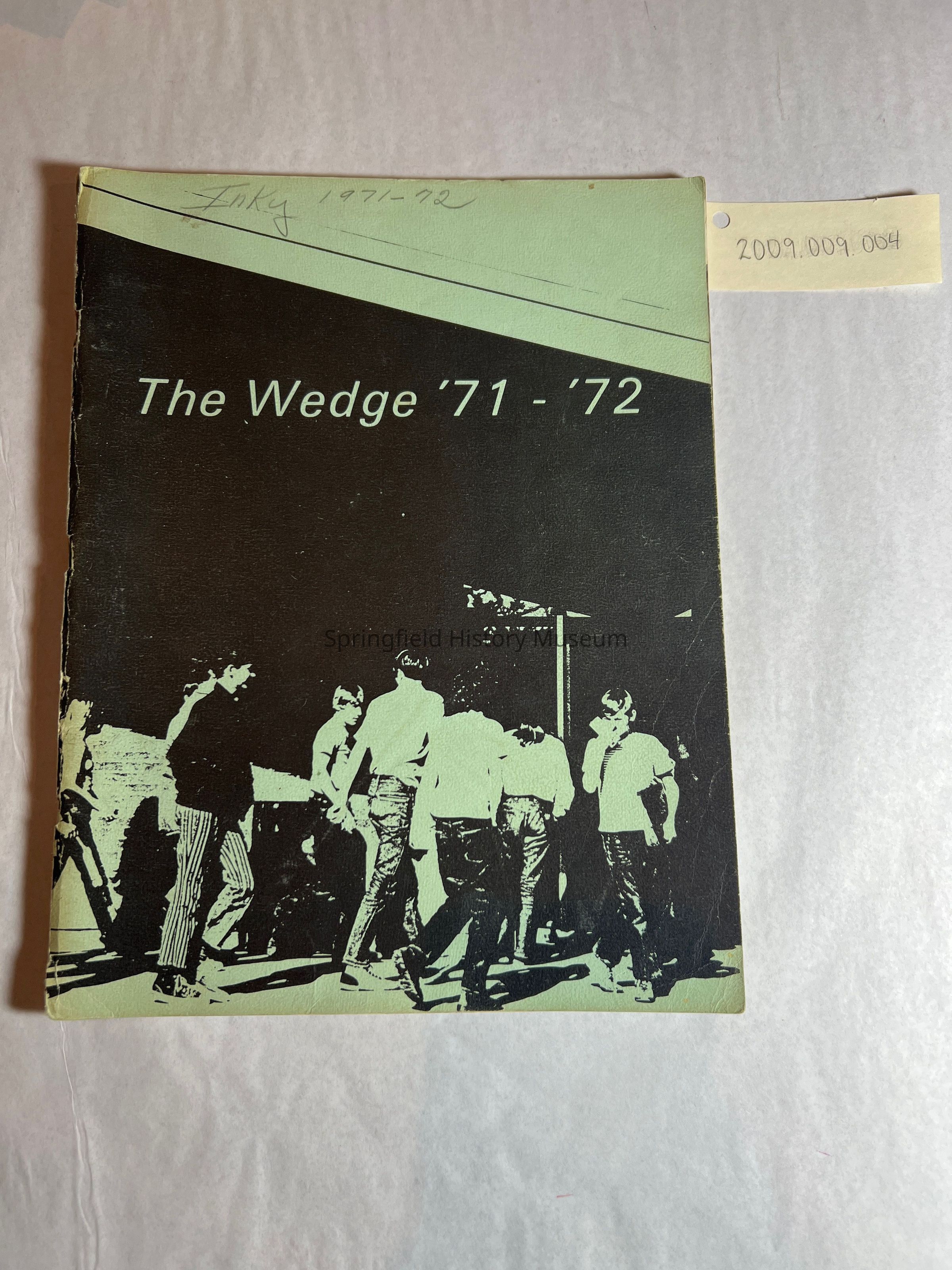 1971 - 1972 edition of "The Wedge". Front cover is mint green with picture of kids walking into a building. Cover has handwritten 'Inky 1971-72' on top of it. Softbound