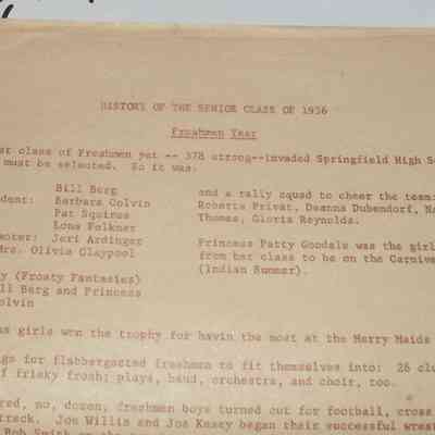 This has a 22 page "History of the Senior Class of 1956" papers that are stapled as a packet. The stapled packet is located separately from the yearbook. The color of the paper may have been a creme or tan color at one time. The writing is typed and the ink is a red color. It has been labeled as 1993.024.004A.Acquisition