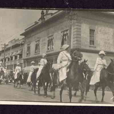 Young girls walking in a parade, Christian Endeavor, Main Street, Springfield, Oregon, 1920