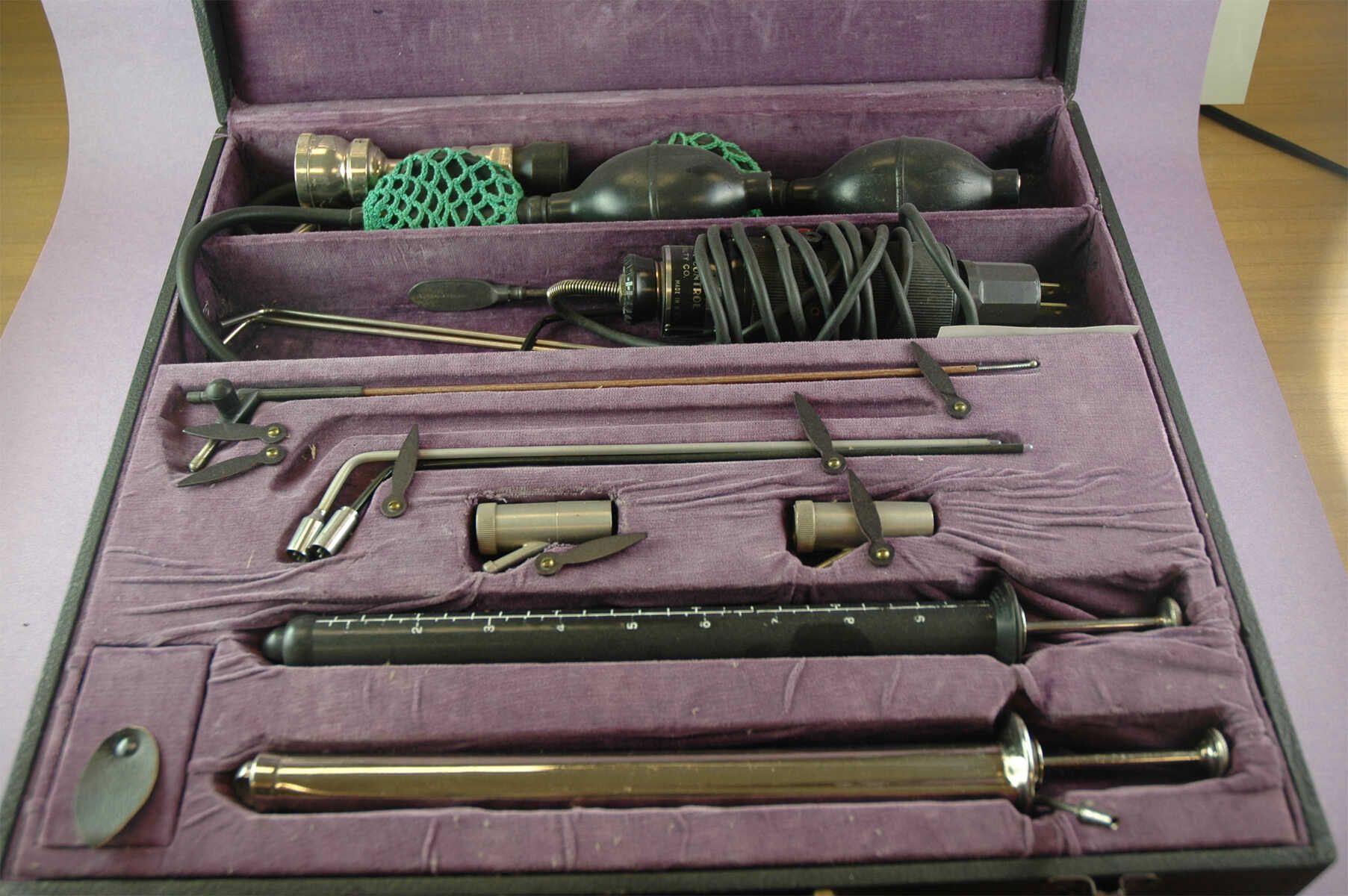 Left; Diagnostic (metal) and electroagulation scopes, Used to examine the lower part of the colon; Label reads: “Diagnostic and Electrocoagulation scopes. Used to examine the lower part of the colon. Designed by Peter Rosi, MD.”