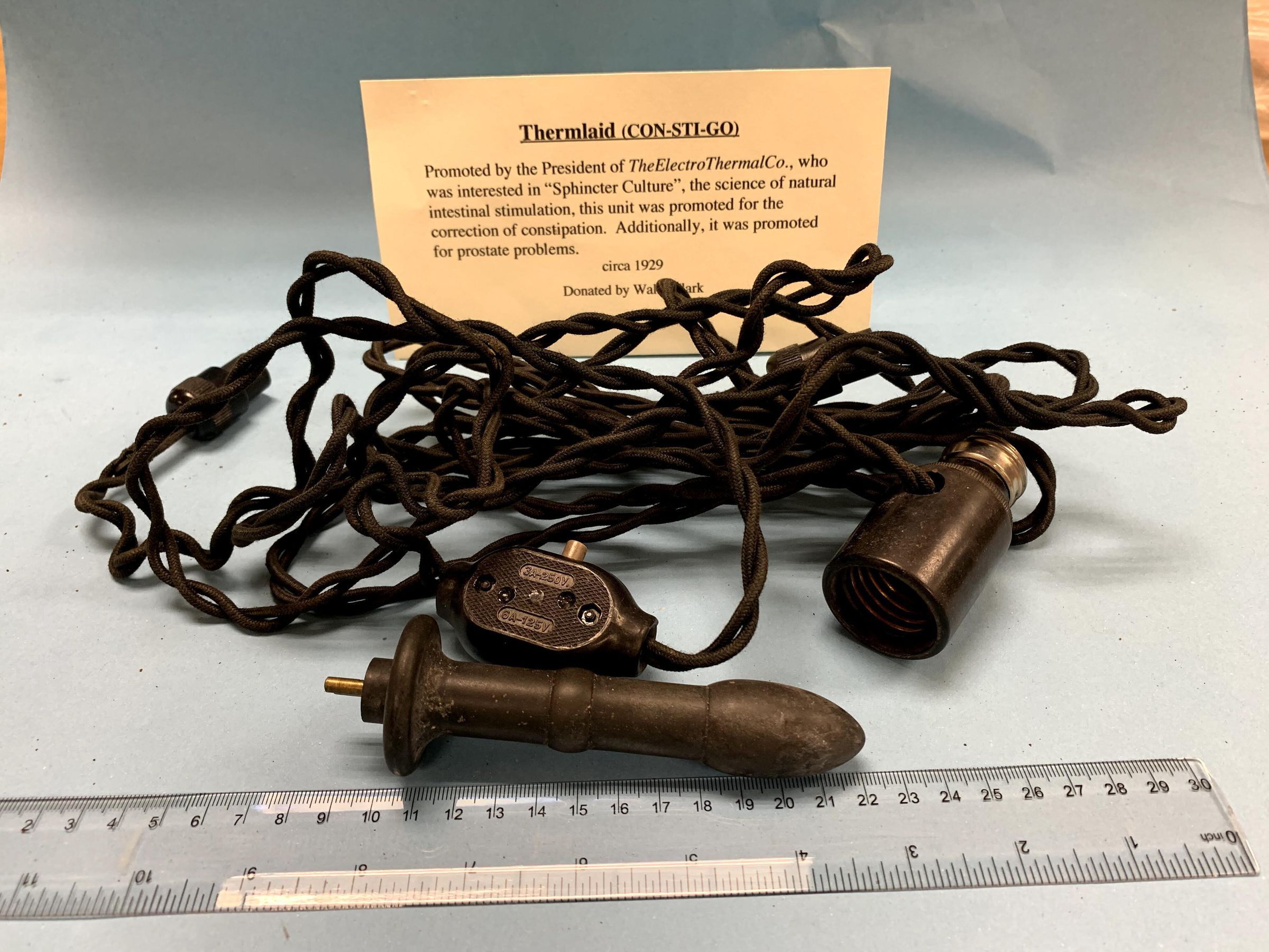 This device was marketed as a prostate gland warmer to dilate the rectum thereby providing gentle stimulation to capillary blood vessels. They were sold under the claim to cure prostate hypertrophy as well as a treatment for constipation and hemorrhoids. These devices were sold primarily through mail-order advertisements in newspapers and magazines along with. Testimonials. The Federal Trade Commission issued a cease and desist order in November of 1936.