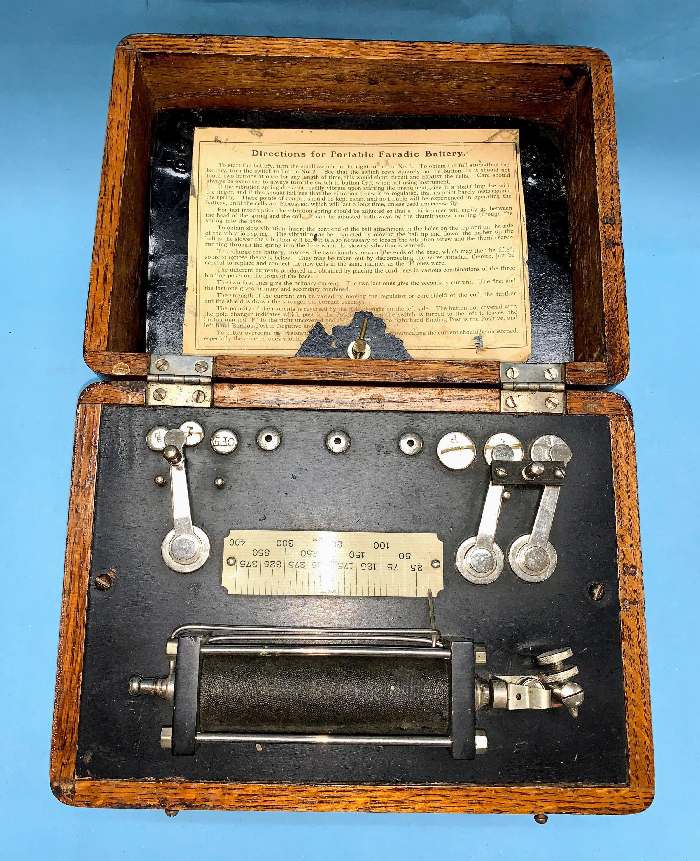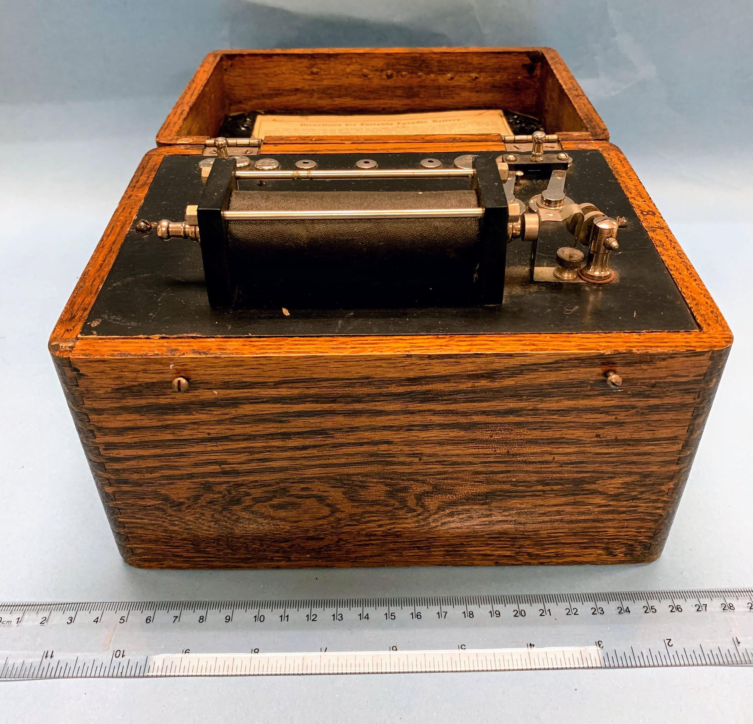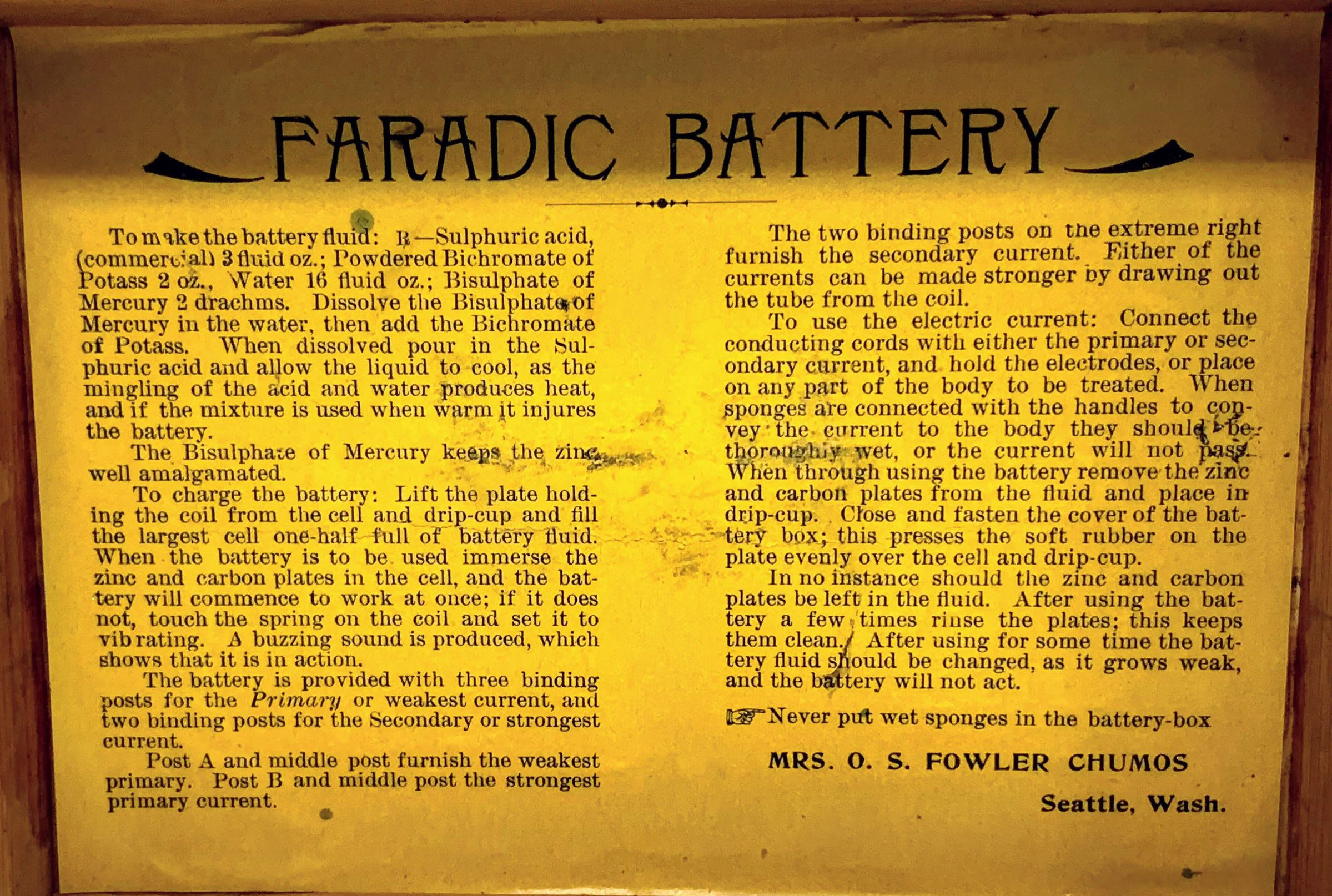 The Faradic Battery, also commonly known as a “Battery Box”, was first patented in 1870 around the same time that dry cell batteries became available. A Faradic type current is a short duration (0.1 to 1.0 millisecond) pulse duration, interrupted direct current. An induction coil was used to boost battery voltage to elicit muscles contractions. These devices became popular during the industrial revolution of the late 19th century as a form of electrotherapeutic therapy to relive symptoms of “nervous exhaustion” from working excessive hours. This condition was first described by American physician George M. Beard in 1869 as “neurasthenia”. The electrical energy from this and other electrical quackery devices was purported to restore the body’s lost energy from over exertion. The Faradic Battery was also marketed to treat headaches, as well as back pain and muscle discomfort.