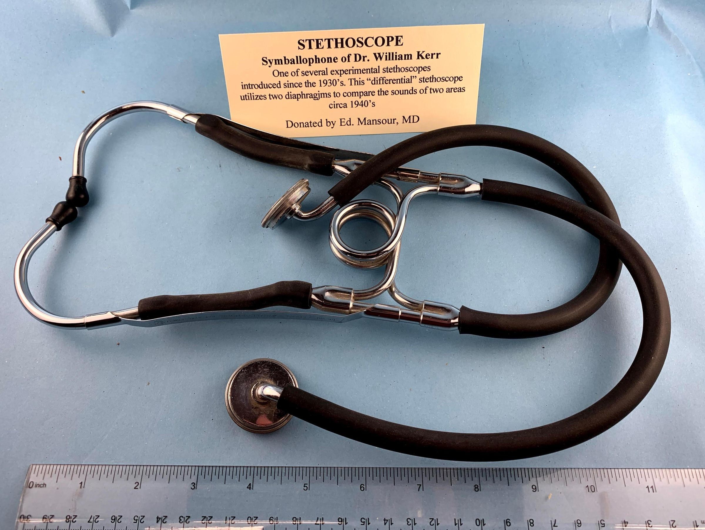 1940 - William J. Kerr's Symballophone. Dr. Kerr was the first full-time Professor and Chair of the Department of Medicine at the University of California San Francisco (UCSF) School of Medicine in 1927. His patent for his symballophone used two diaphragm chest pieces rather than bell chest pieces. Sounds from either chest piece could be heard in both ears so that the examiner could compare sounds coming from different parts of the chest. Note the double-looping tube connections of the binaural earpieces, so that each ear could hear the sound from either chest piece