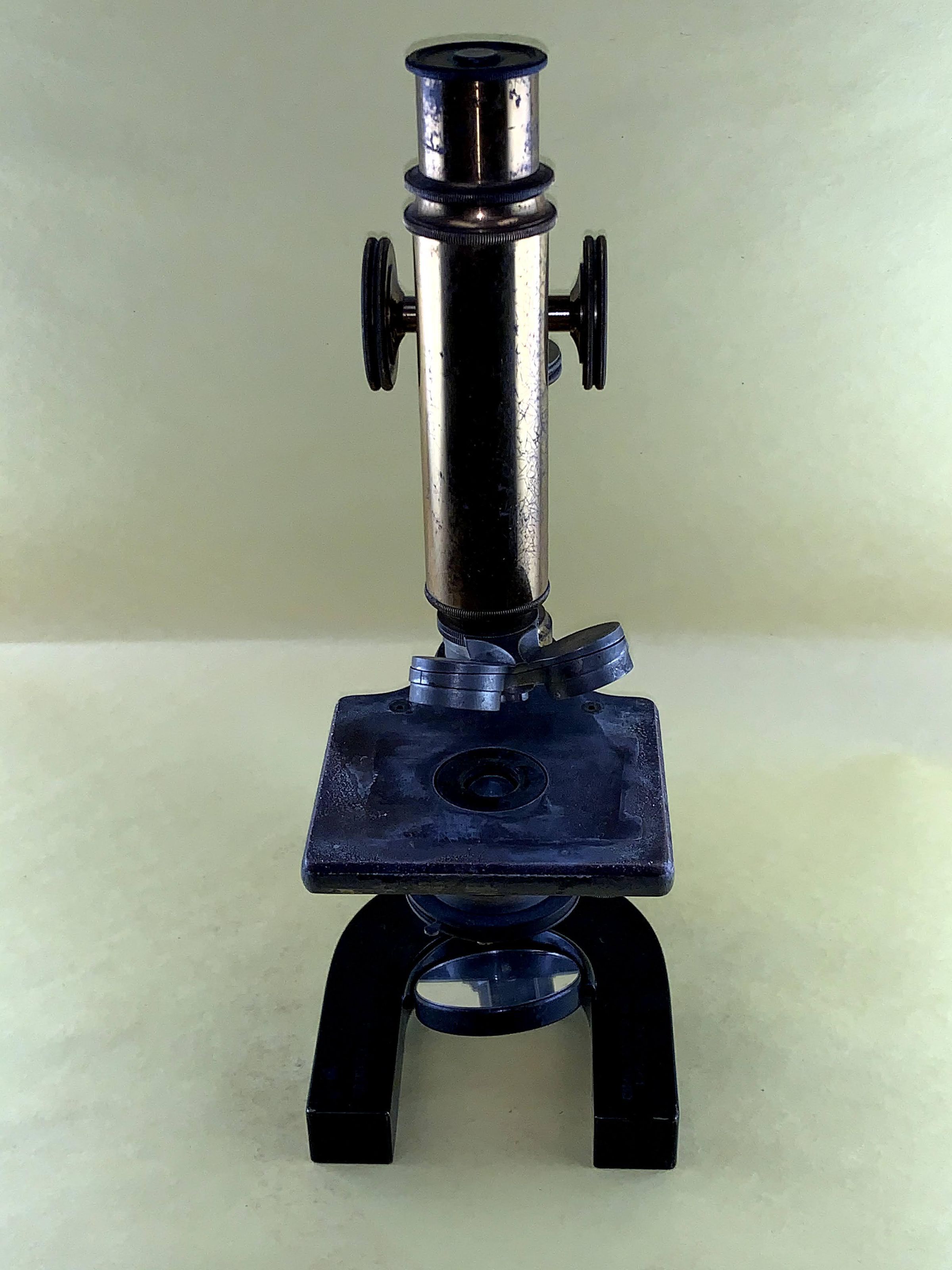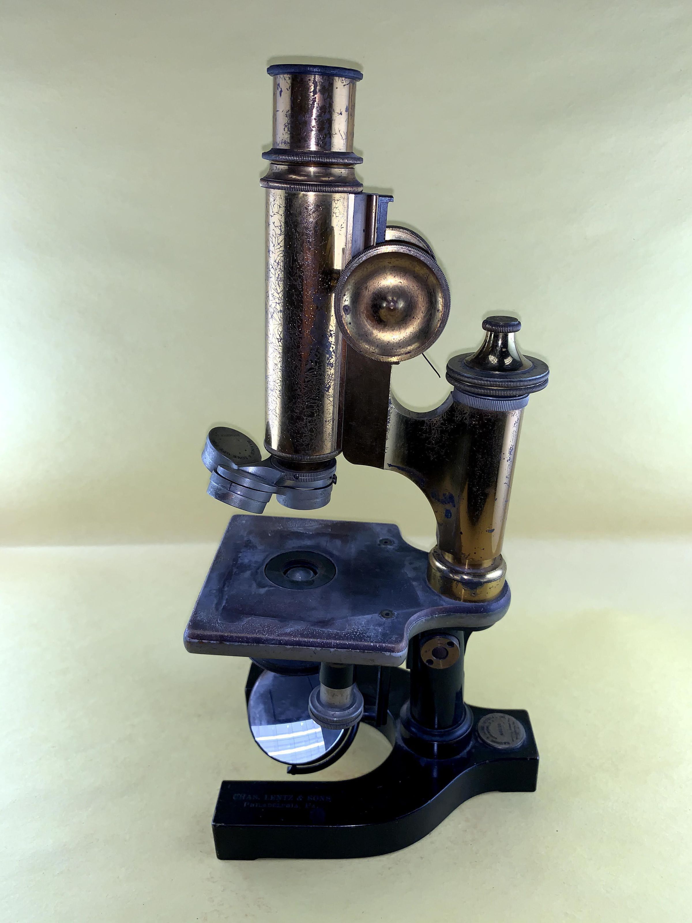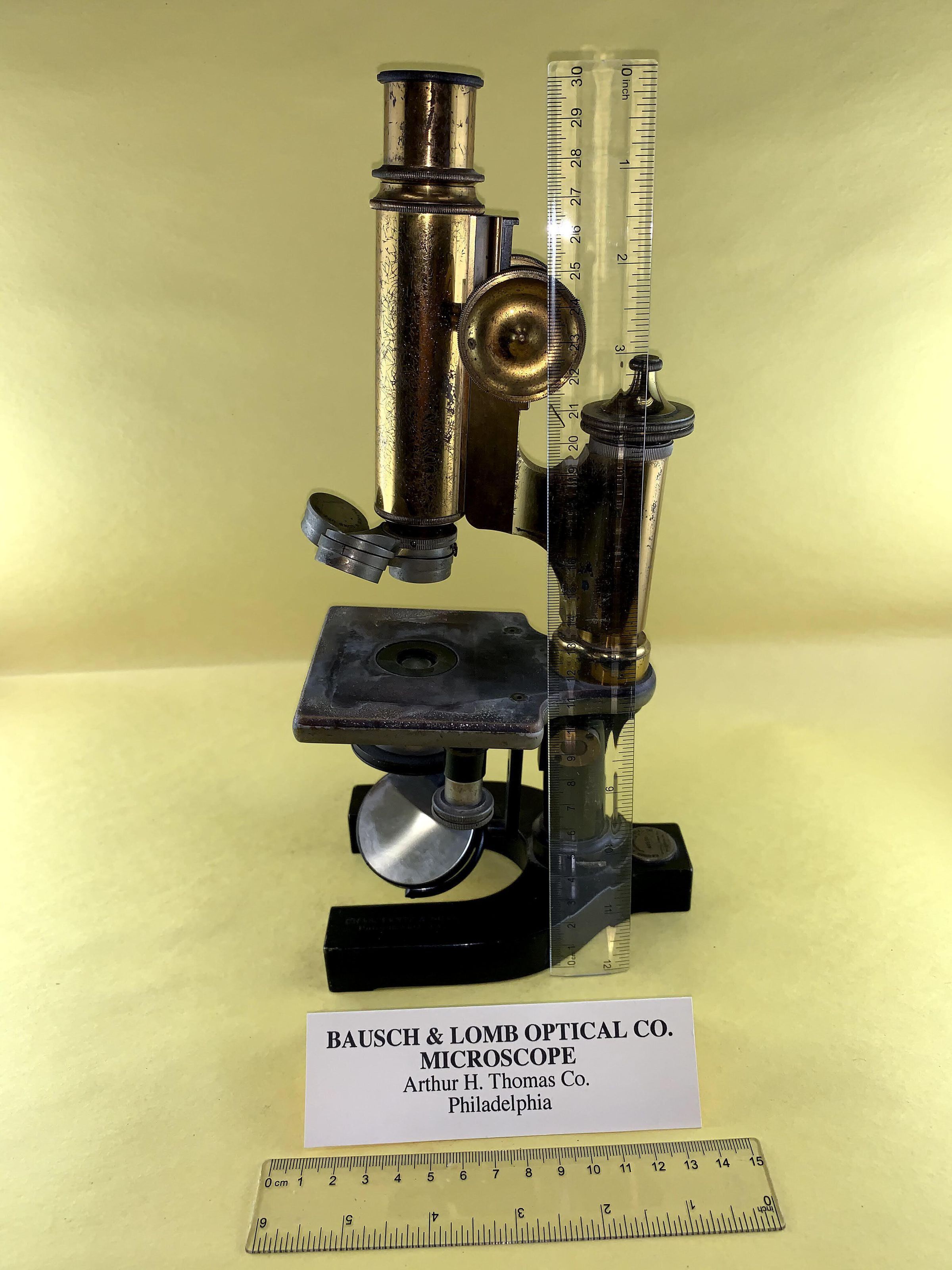 gold- colored microscope, eyepiece is about 1 “ in diameter; microscope is labeled Chas.