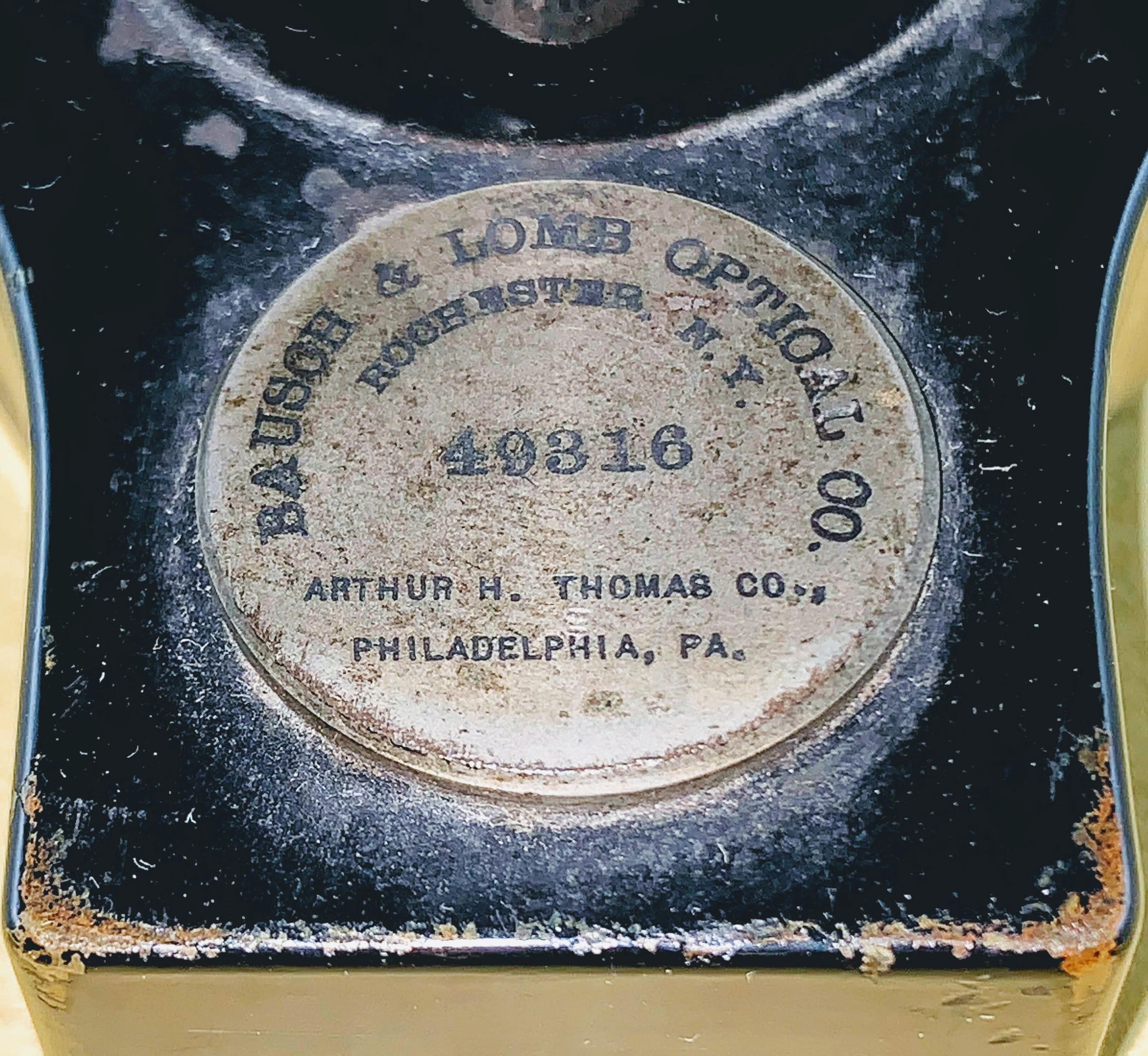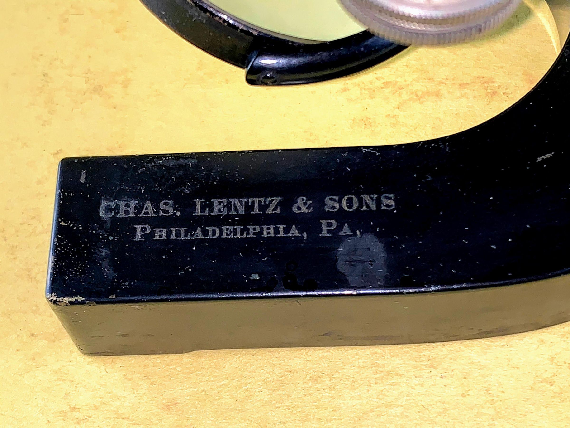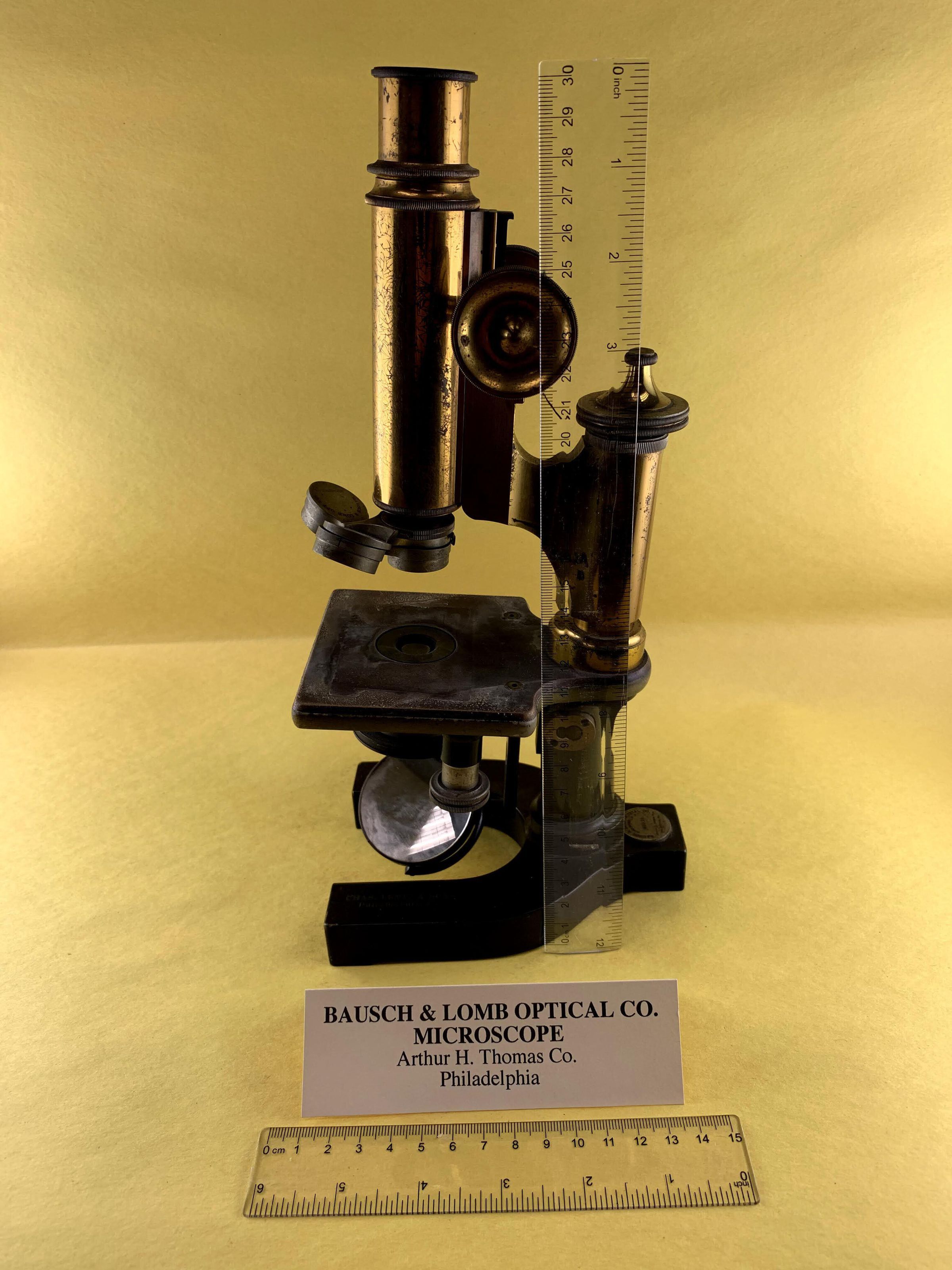 gold- colored microscope, eyepiece is about 1 “ in diameter; microscope is labeled Chas.