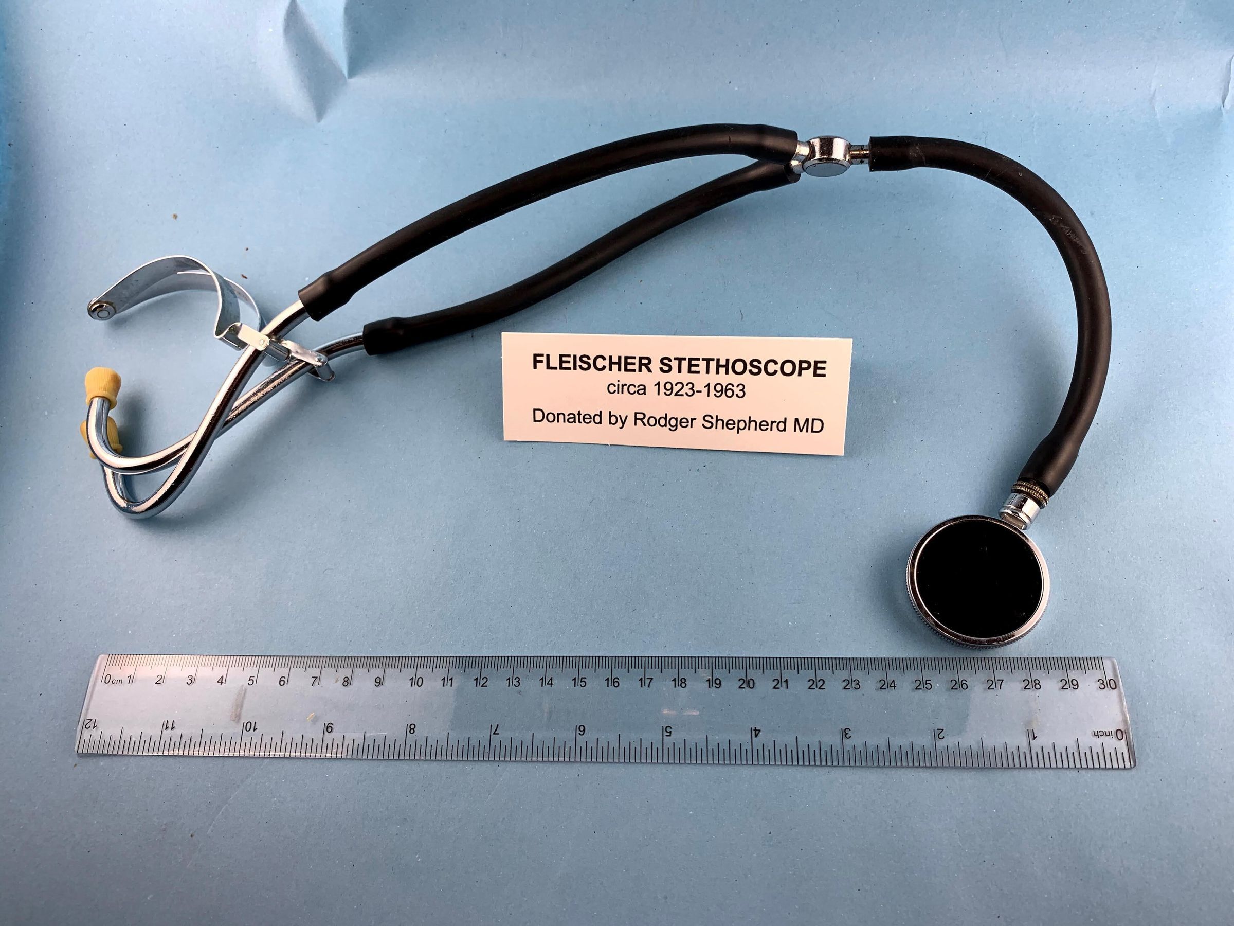 1913 - Fleisher Stethoscope. This stethoscope was developed by and named after Andrew W. "Doc" Fleischer, a pharmacist who joined Becton Dickinson and Company, a medical device import company, in 1921. He gained fame for developing the blood-pressure instrument. He also improved the stethoscope, experimenting until he developed one that reduced extraneous sounds and allowed physicians to monitor heart sounds more accurately.