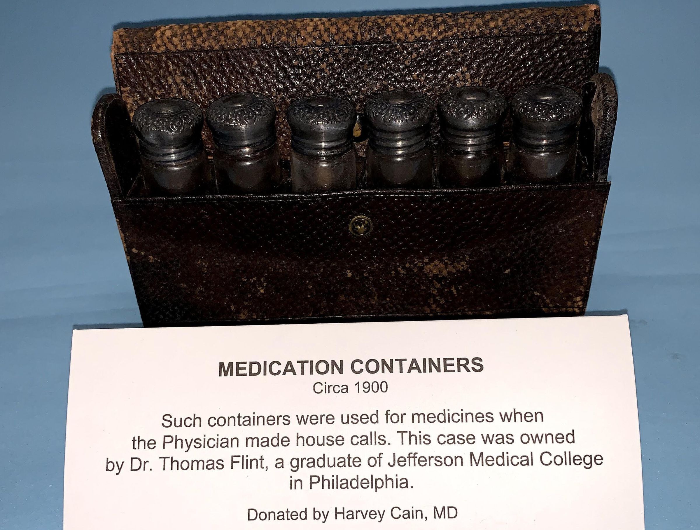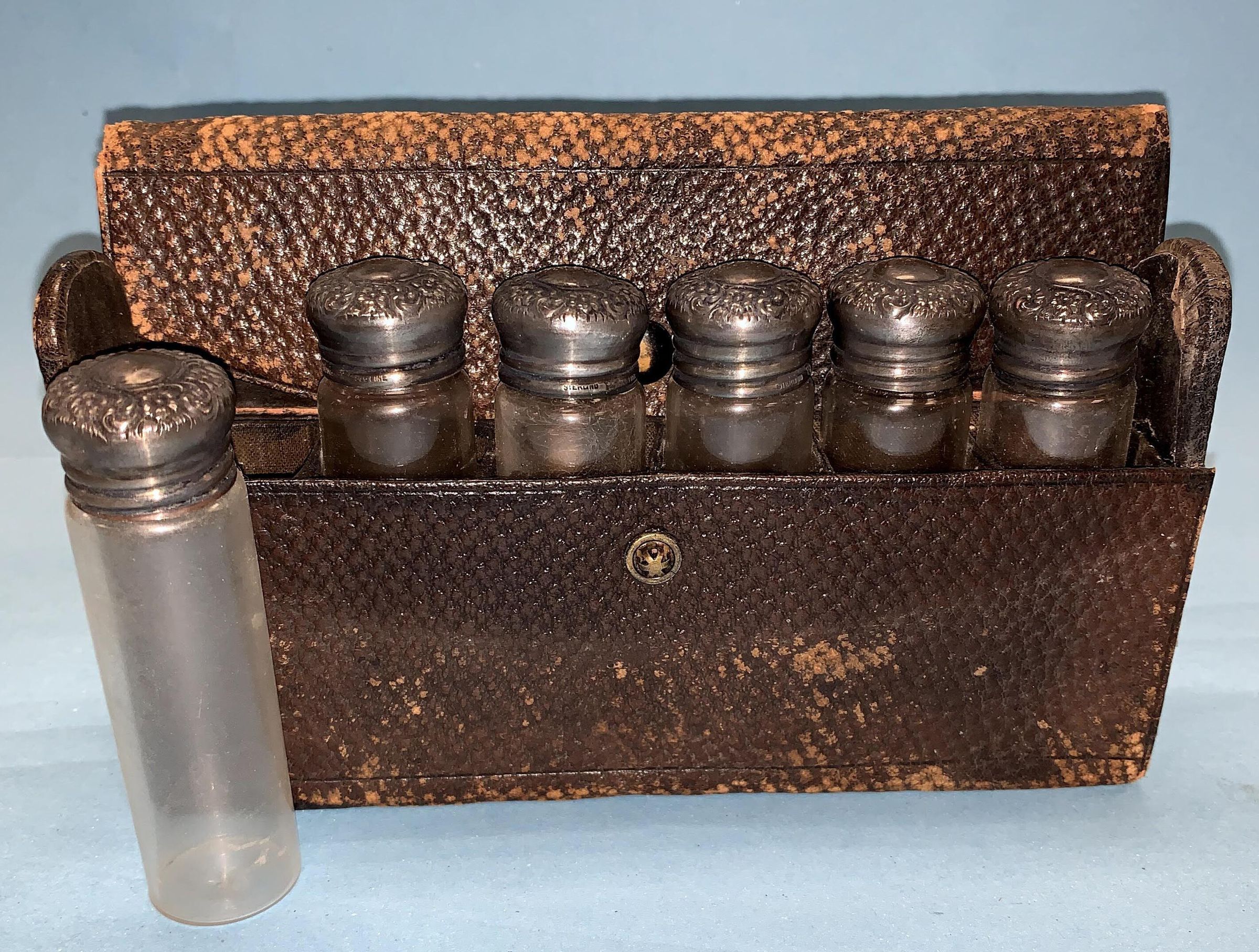 MED KIT, LEATHER, EMPTY BOTTLES WITH FANCY CAPS