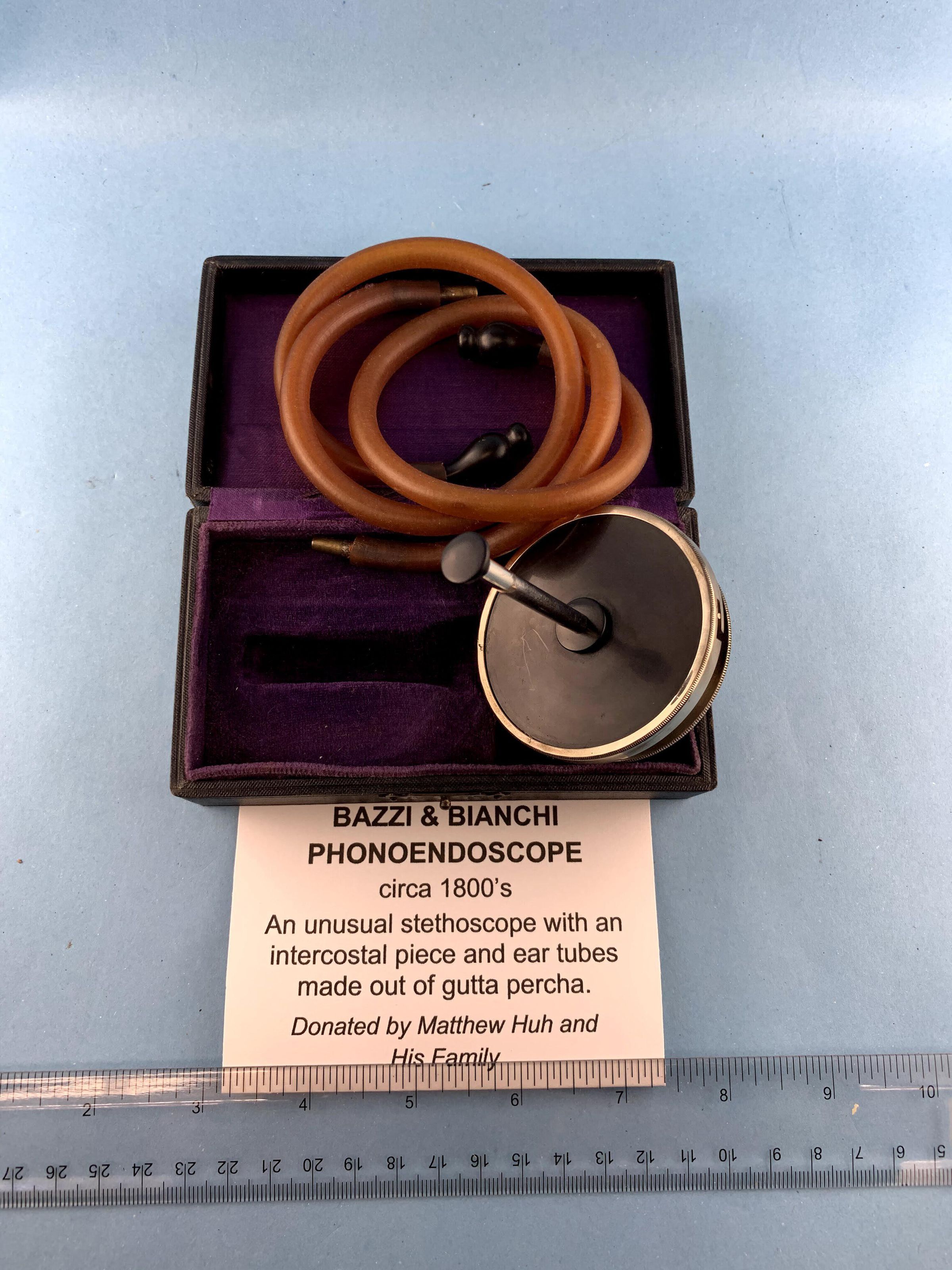 1894 - Eugenio Bazzi, an Italian physicist and Aurelio Bianchi, a Professor of Pathology developed the Phonendoscope.. It was the first stethoscope to incorporate the use of a rigid diaphragm membrane. The Phonendoscope was a small round unit with two diaphragm membranes placed next to each other. A small solid rod which had a small gutta-percha chest piece was attached to the diaphragm. The unit could be used with or without the localizing rod. There were two long runner earpieces that attached to the top of the unit. It was completely collapsible and measured only three inches in diameter. Bianchi developed this with the idea that the small chest piece could fit between the ribs and convey better sounds. The Phonendoscope was marketed in America by the G. Pilling Company of Philadelphia. In spite of these advantages, its use never became widespread.