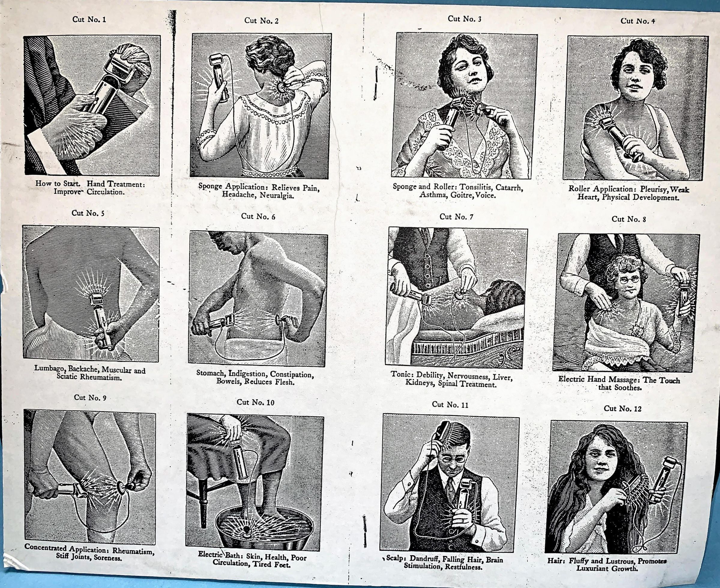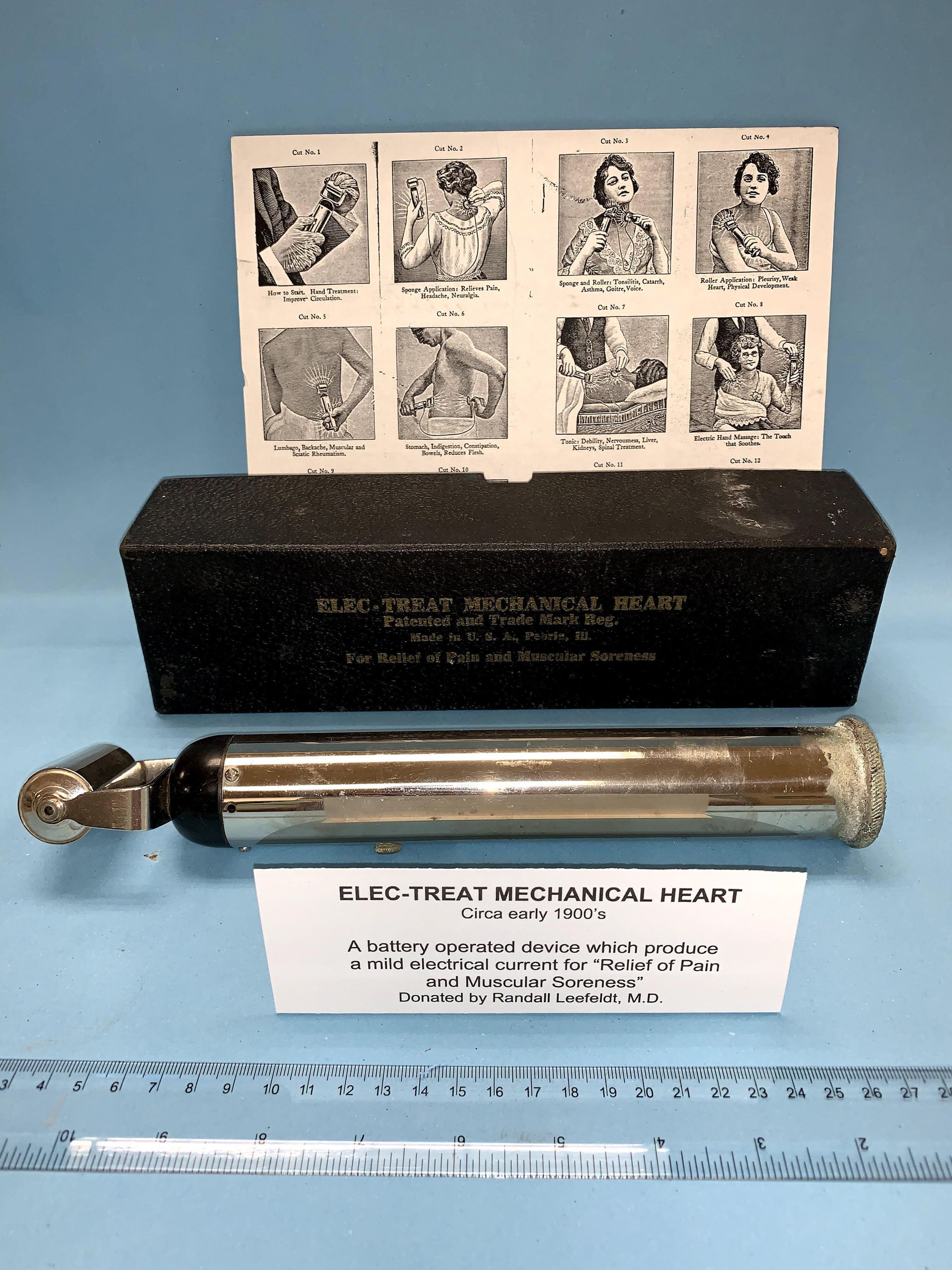 The Electreat, also marketed as the “ Electreat Mechanical Heart”, was an early TENS (Transcutaneous Electrical Nerve Stimulation) device that used two D-cell batteries.The unit was held in one hand and the roller was applied to the treated area. There was also a second, sponge electrode attachment (not shown) that was encouraged for reducing dandruff and relieving constipation. The manufacturer promoted the use of this device to relieve pain associated with back and stomach aches as well as rheumatism. One of the few electro-therapeutic quack devices not banned by the FDA in the 1930’s. Sold by the Electreat Manufacturing Company of Peoria, Illinois.