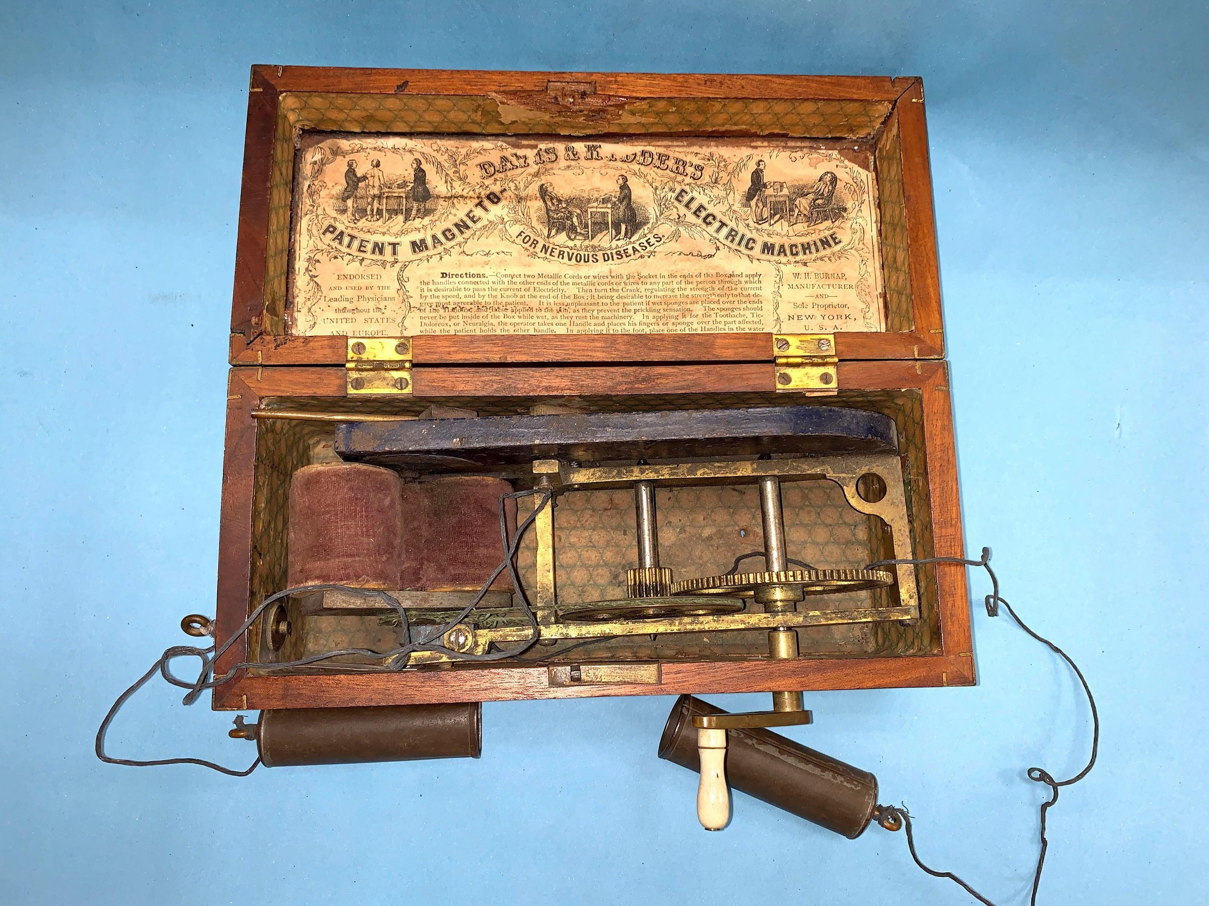 These were some of the earliest electrotherapeutic devices manufactured in the United States in 1854 and marketed by Dr. Jerome H. Kidder. These were manually operated magnetos capable of generating Faradic (irregular alternating) currents to relieve pain and partial paralysis. The patient would grasp the metal electrodes while the doctor or someone else cranked the device generating therapeutic currents through the body causing involuntary muscle contractions. These Kidder portable devices were usually housed in beautiful hardwood cases with brass contact switches. Eventually, the 1938 Federal Food, Drug and Cosmetic Act was instrumental in diminishing the sale of these devices to the public for electrotherapeutic purposes.