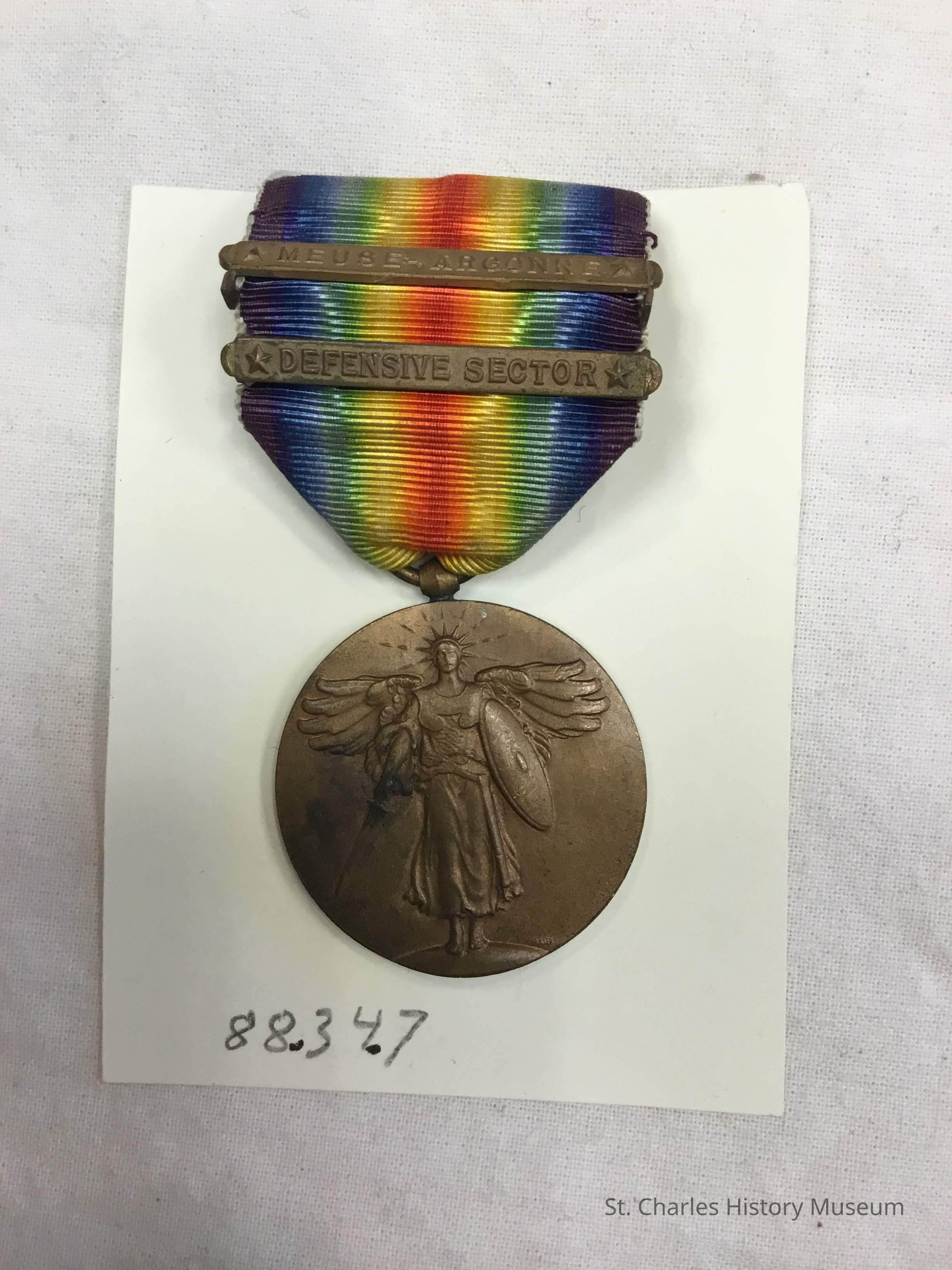 World War I Victory Medal; Obverse: relief of Goddess Nike "Winged Victory" with sword and shield depicted; Reverse: relief of a shield and a fascine depicted; embossed text "THE GREAT WAR FOR CIVILIZATION FRANCE ITALY SERBIA JAPAN MONTENEGRO RUSSIA GREECE GREAT BRITAIN BELGIUM BRAZIL PORTUGAL RUMANIA CHINA"; rainbow striped ribbon; three bronze clasps with embossed text " MEUSE-ARGONNE, DEFENSIVE SECTOR" on ribbon.Collection