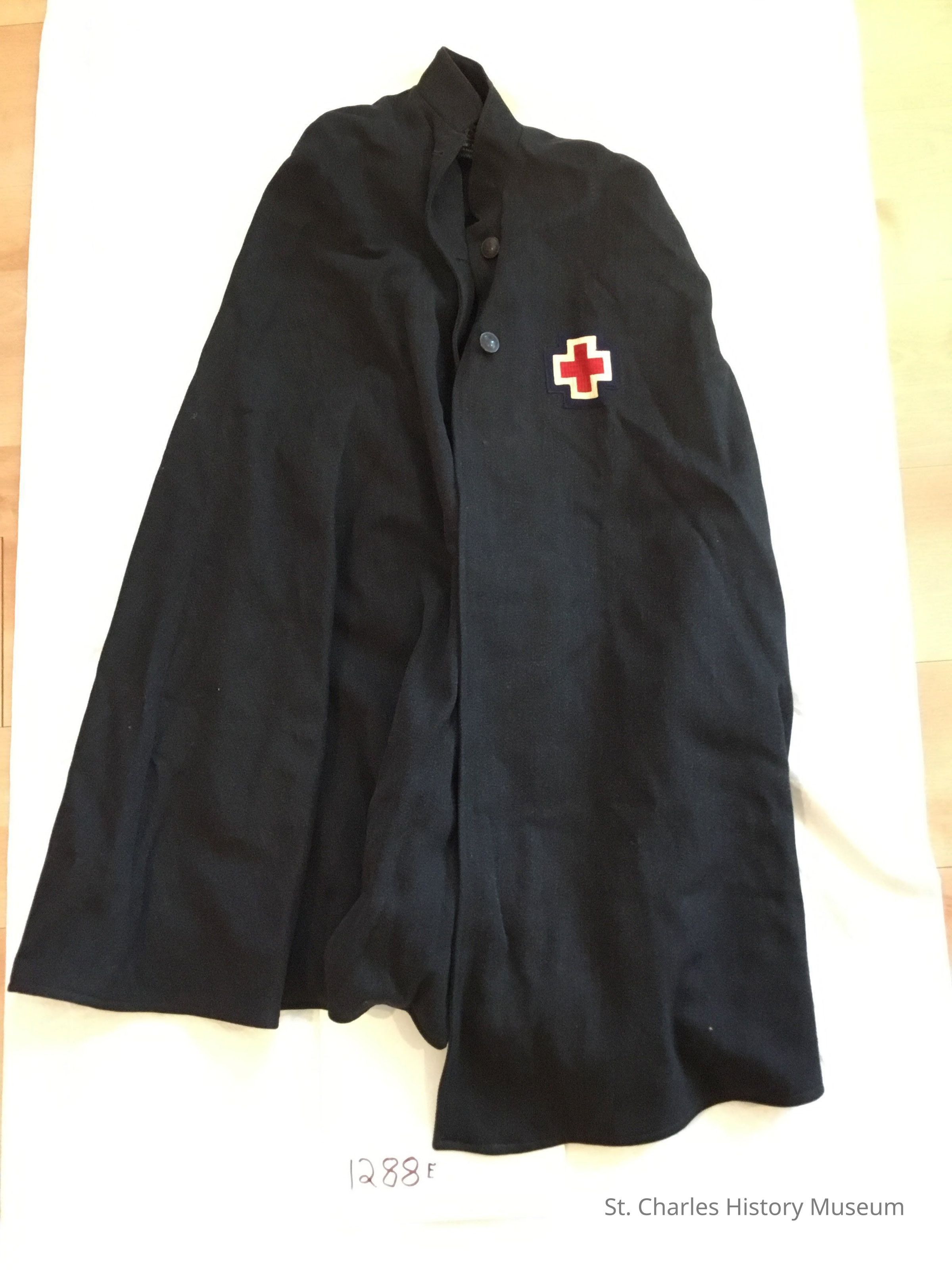Case on base; painted gray, containing WWI Red Cross uniform worn by Emma S. Lake in France; Miss Lake was born in St. Charles in 1874; Uniform is dark green with gray blouse and blue tie; case was dismantled and discarded; 1288a=dark blue green uniform jacket; Red Cross; four pockets on front. three button front closure; blue epalets on collar; red enamel "Red Cross" pins on shoulder; buttons have cross on top; 1288b=shirt; gray wool, long sleeve, two breast pockets; button front; label in neckline "gunflint-The Kennoc Co. St. Paul, Minn"; 1288c=gray cotton, summer skirt or underskirt; waistband, button at front, rounded button with cross on front.