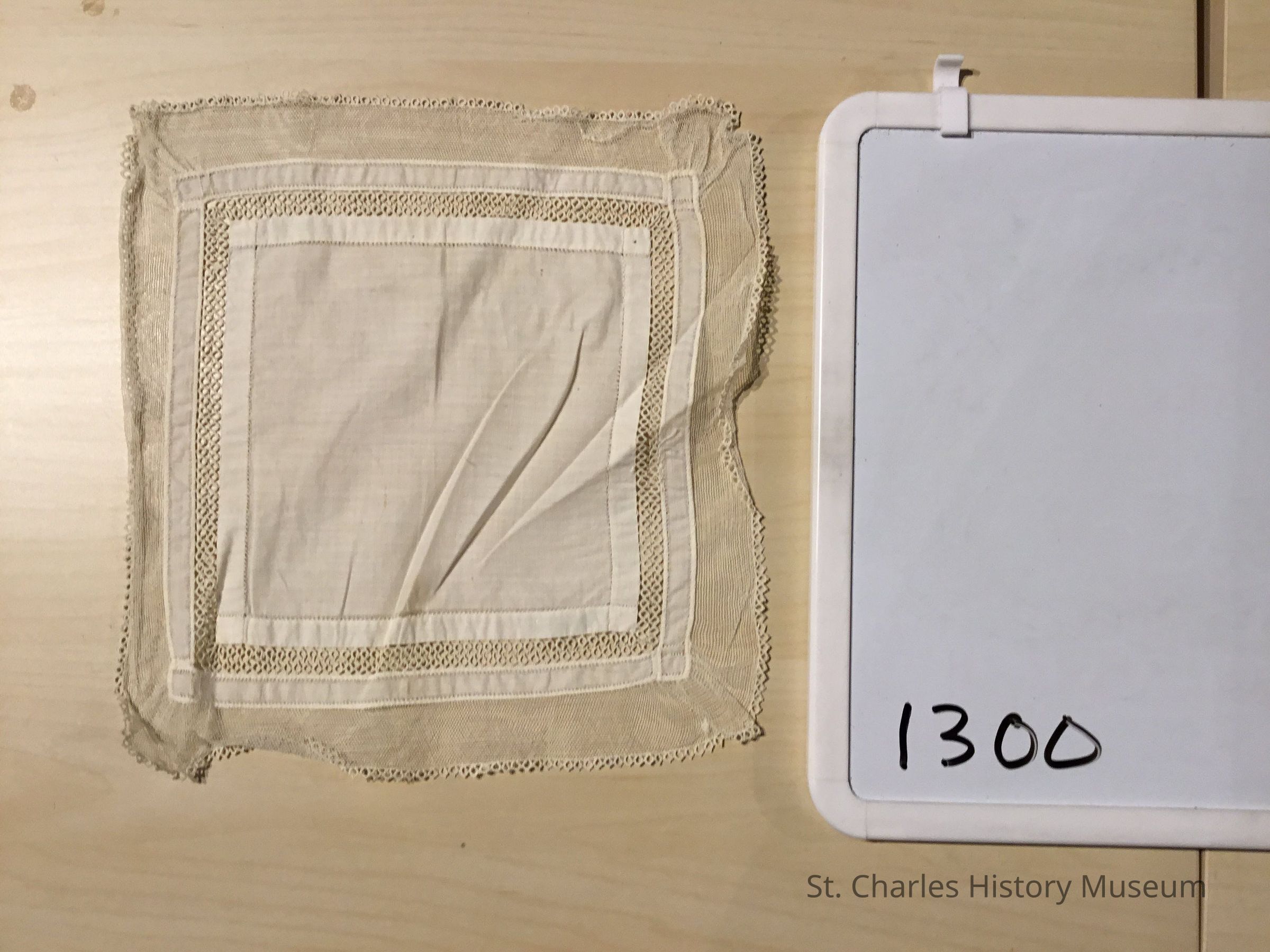 White linen handkerchief with tatted and hand hemstitched border. 10 1/4" square. Used by Roxanna Clemens Hathaway, grandmother of the donor, who lived and died in Clio, Michigan. Her husband was a Methodist minister, and she was related to Samuel Clemens (Mark Twain).