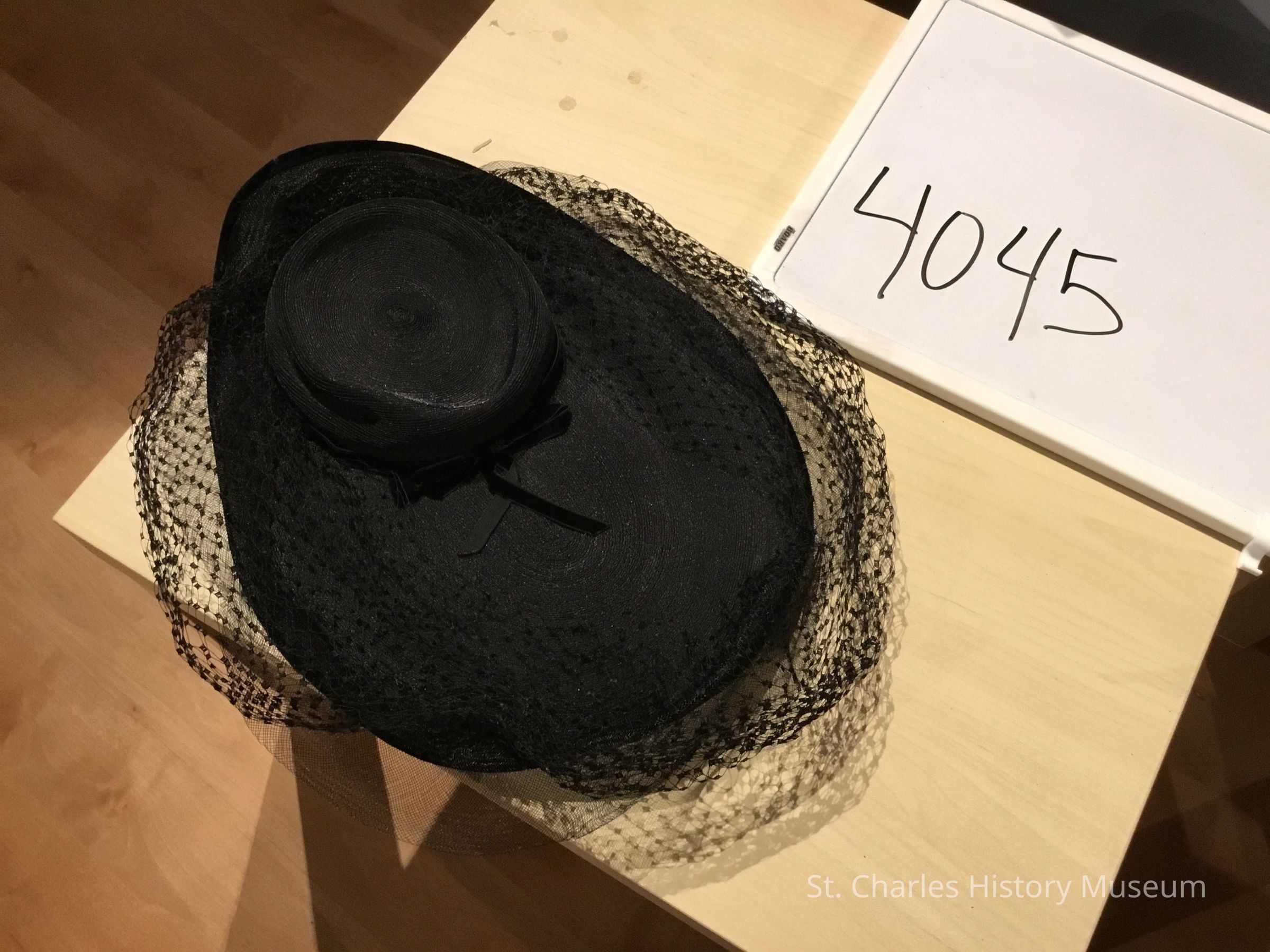 Black velvet ribbon around crown. Long hat pin