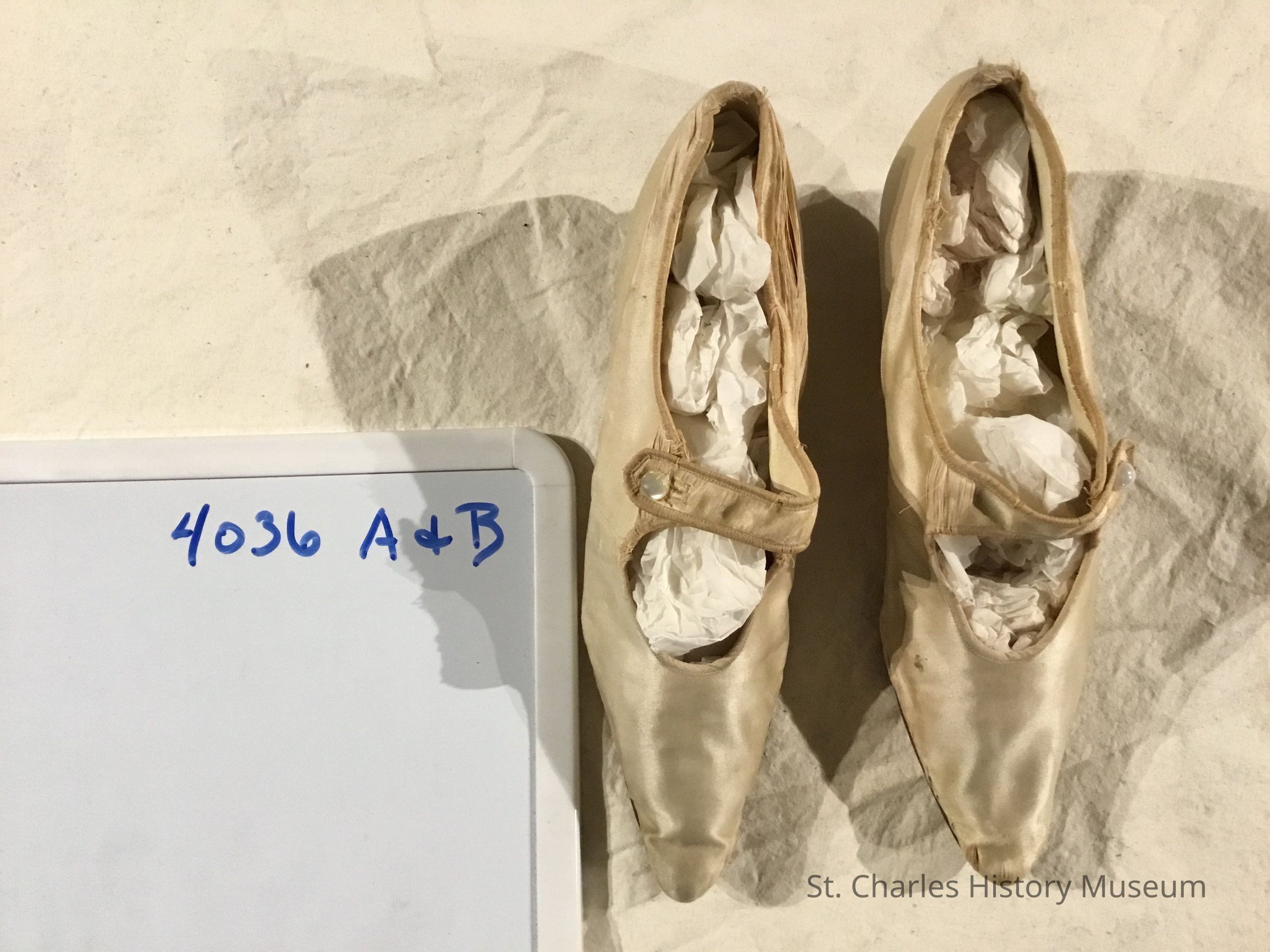 Pair of women's white satin shoes owned by Barbara Dunham Dole. - 1927