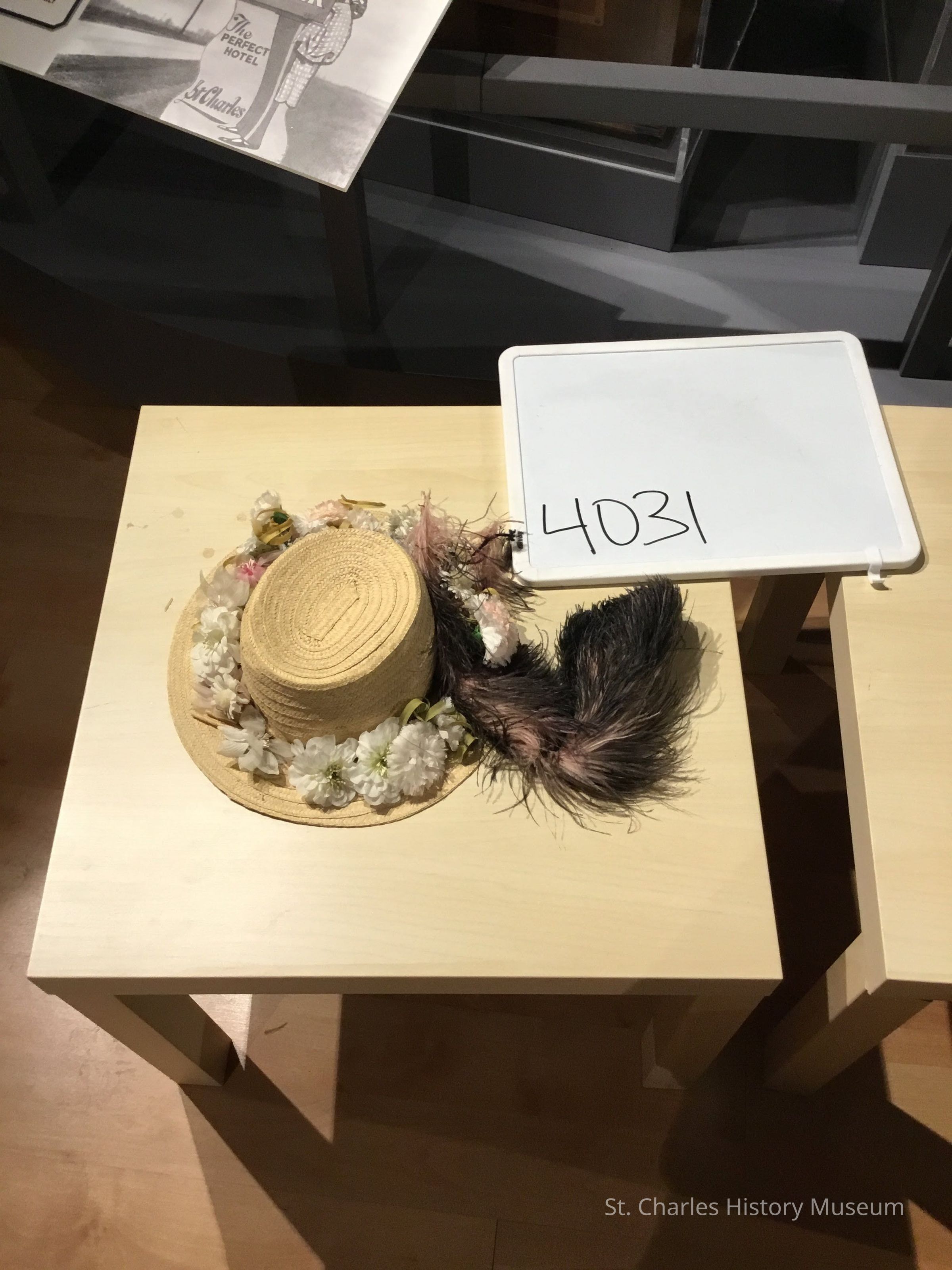 Straw hat - flowers - 1915 11 7/8"W x 3 7/8" H Straw hat with brim. Pink and white silk flowers around brim. In a round handbox decorated with violets. Condition: No Damage