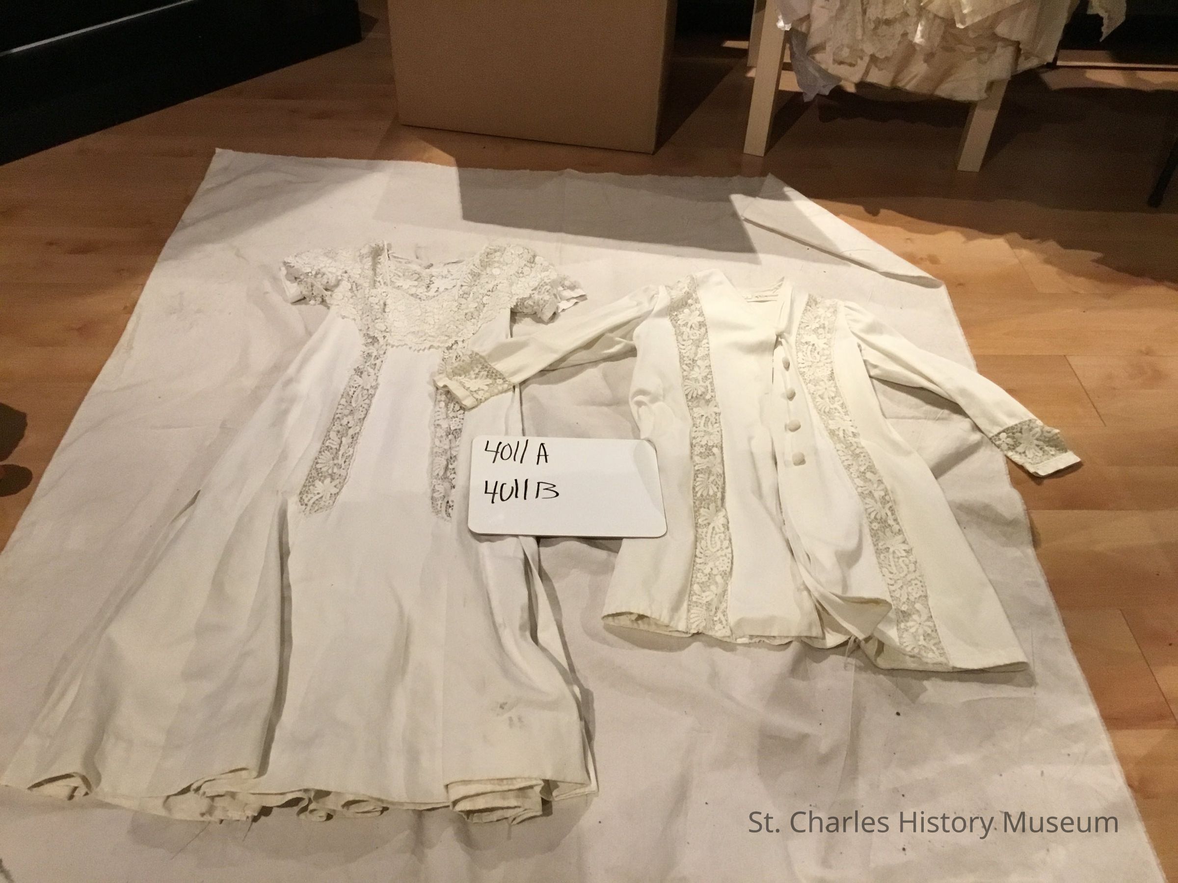a. Dress - white, short sleeved. Lace ruffles at bodice. V-neck. Two lace inserts down front and back of dress. Lower half of skirt has tucks. Snap and hook and eye closure Approx 48"L