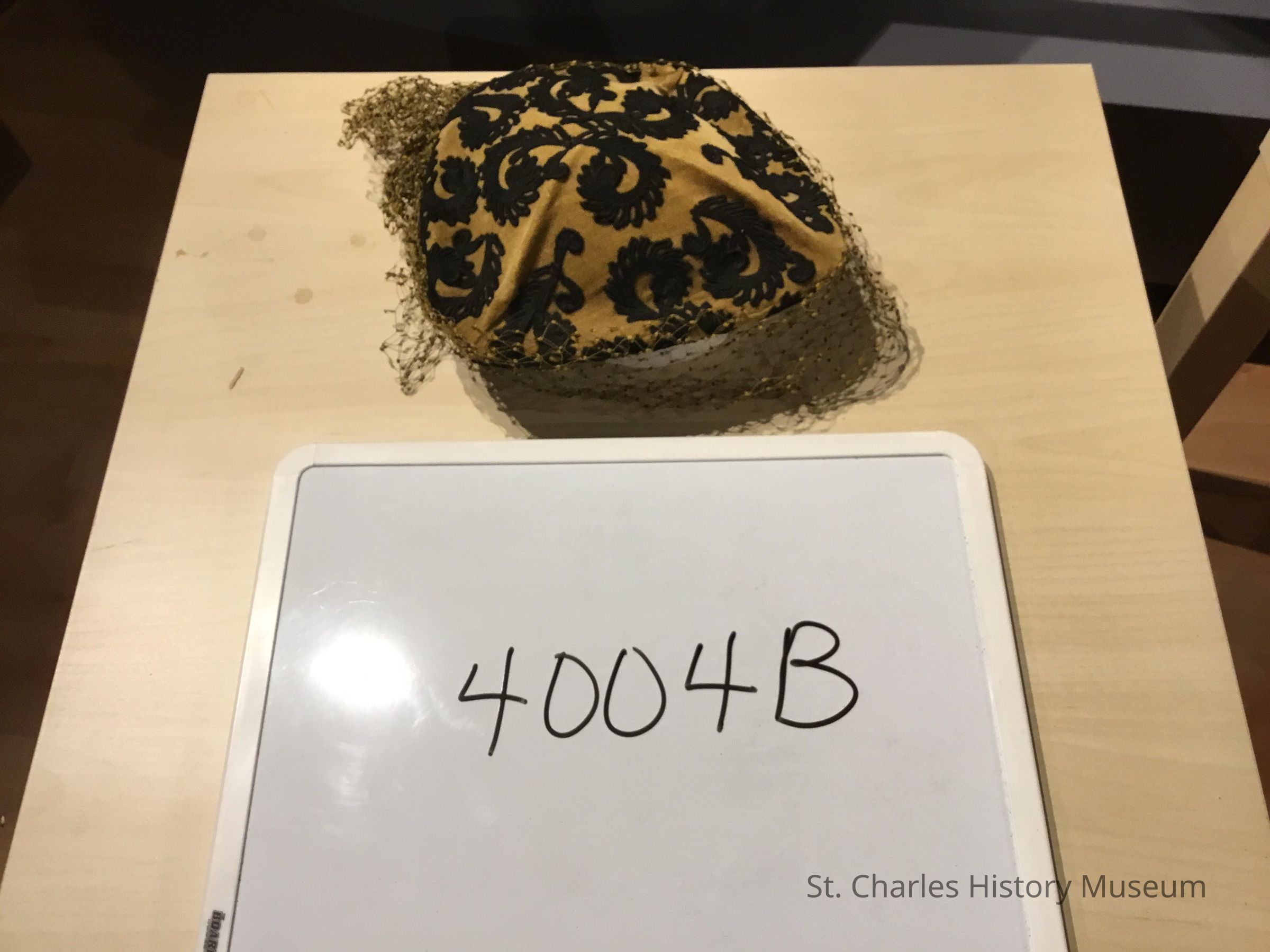b. hat - yellow green velour with black appliques, green and black net. 9"W oblong circle shaped.