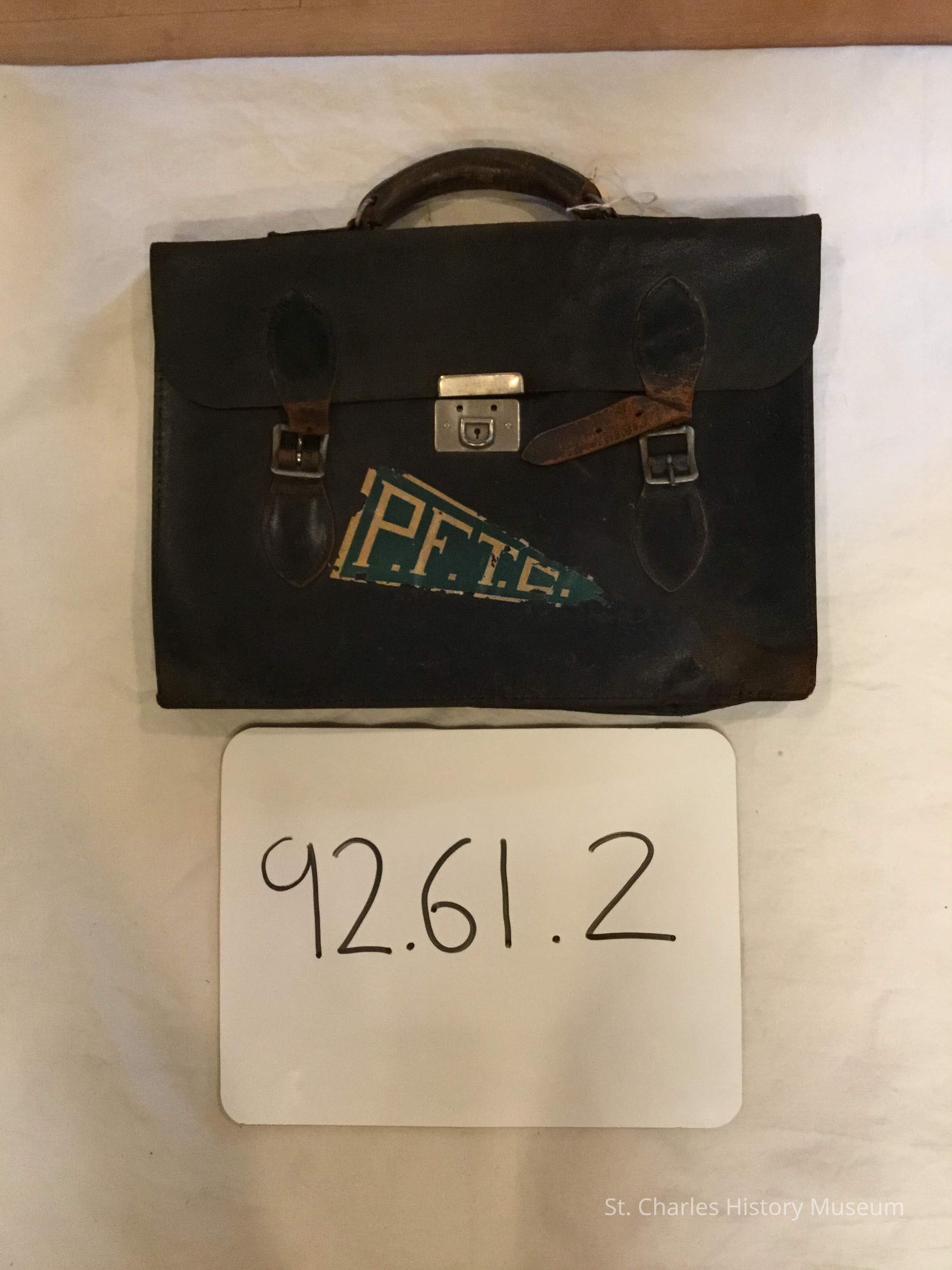 Book bag; P.F.T.C. in pennant on bag; poor condition; right side ripped outLexicon