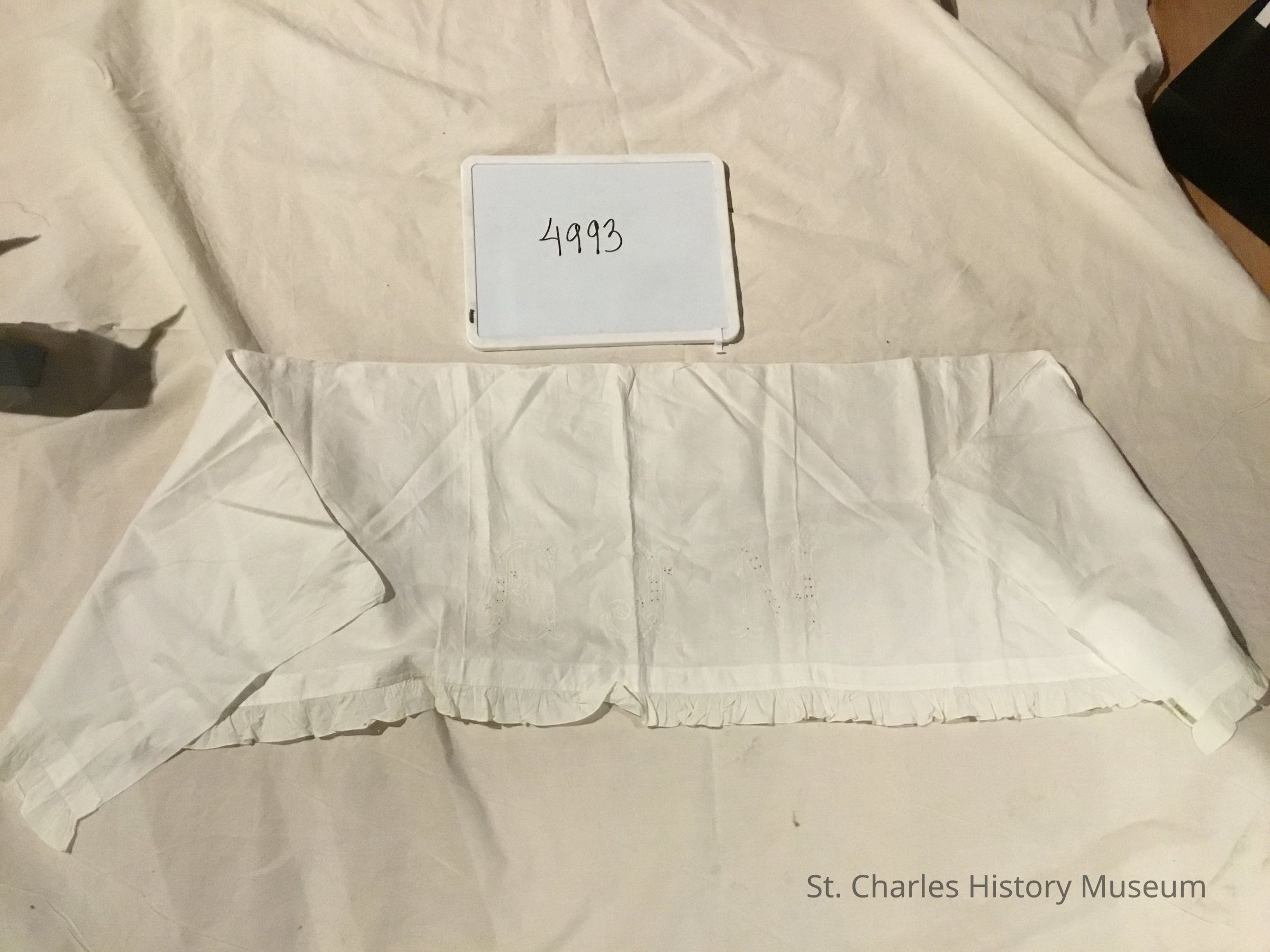 Dresser scarfm white, monogrammed "EJM"; ruffled hemLexicon