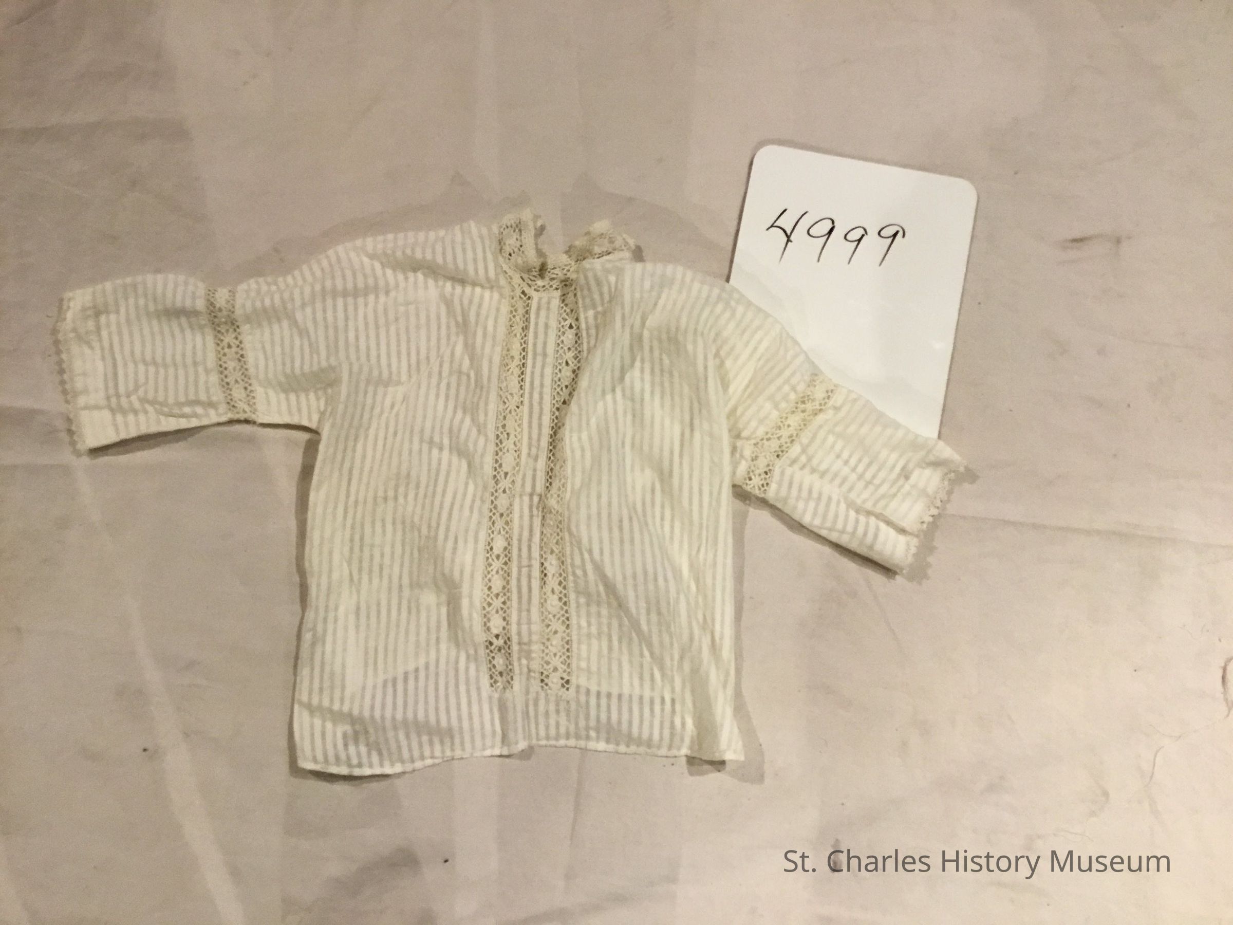 White with crochet trim and collar; buttons down back; ribbon added at back-current