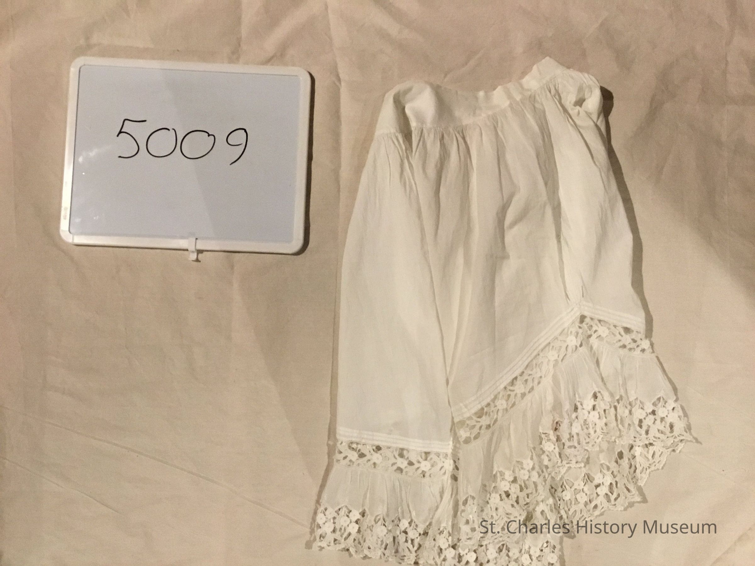 White, heavy lace flounce on hems; pleating and lace above hem; set in waistband with one button closure.