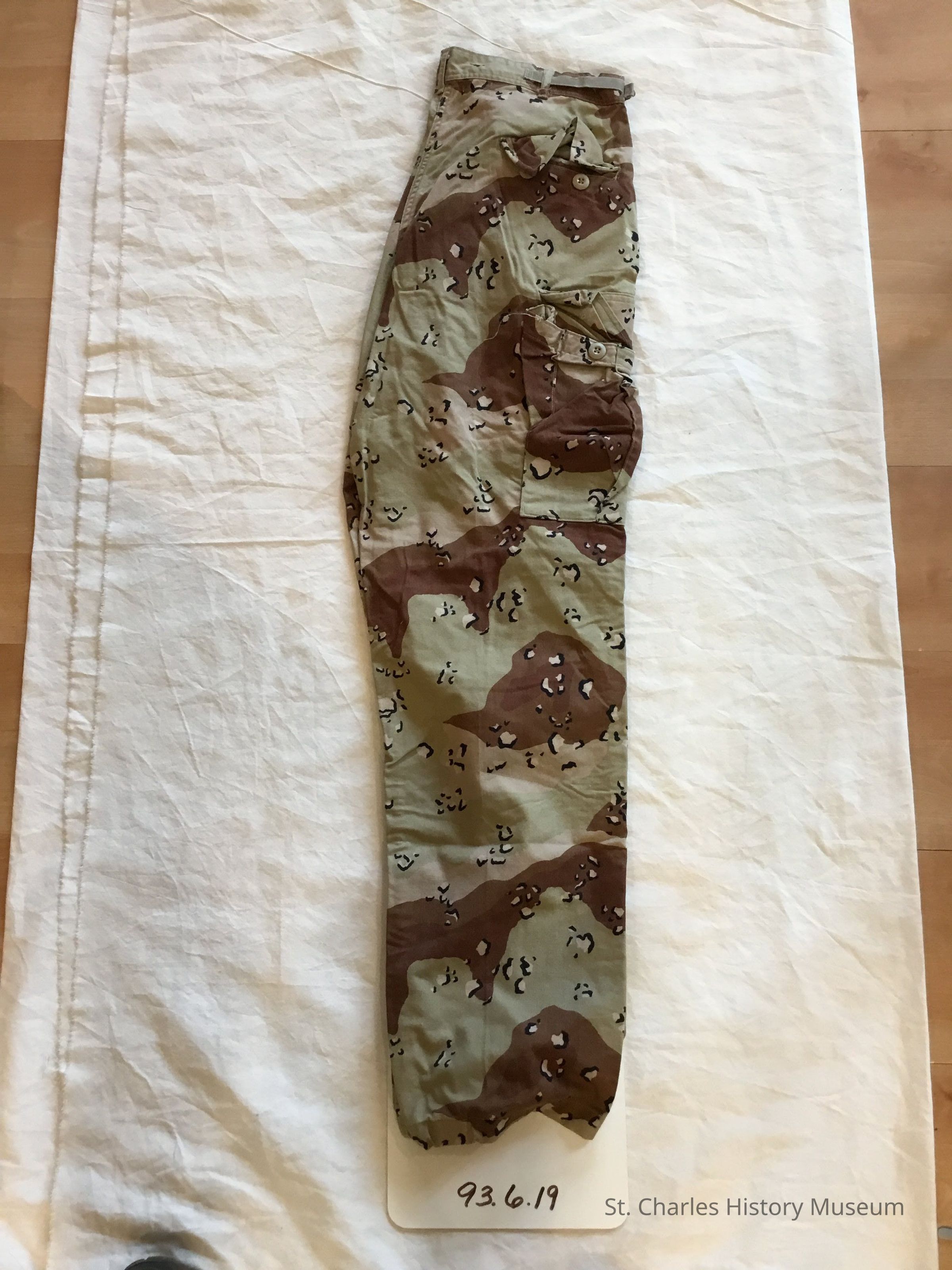 Army Uniform Pants; 32 waist, 35 inseam; Camouflage pattern worn by Desert Storm personnel; 1990-1991Lexicon