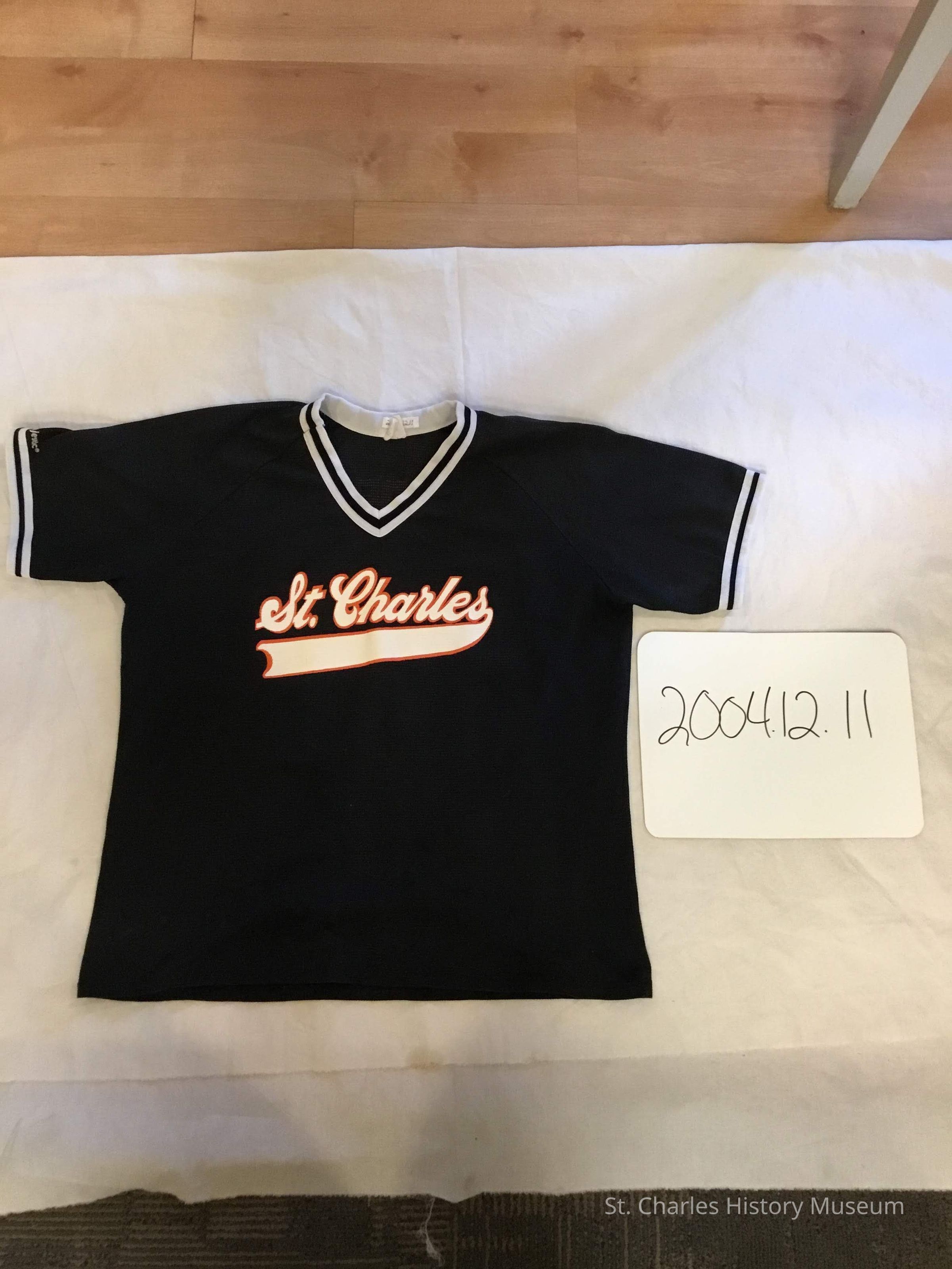 St. Charles Baseball jersey, size XL 5/50 cotton poly blend. Shirt is black with white and black edging around the neck and arms, features St. Charles printed on the front of the shirt and the name Winder with the number 29 on the back.